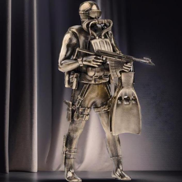 Êîëëåêöèîííàÿ ñòàòóýòêà âîäîëàçà â ãèäðîêîñòþìå ñ âîäîëàçíûì ñíàðÿæåíèåì, â ìàñêå, ñ ëàñòàìè â ðóêàõ è ãàðïóíîì íàãîòîâå. Ïðèìå÷àòåëüíî, ÷òî ïðîôåññèÿ âîäîëàçà â Ðîññèè ïðèðàâíèâàåòñÿ ê îñîáî âðåäíûì è ñîïðÿæåííûì ñ ðèñêîì äëÿ æèçíè. Ïðîôåññèÿ âîäîëàçà ïðåäïîëàãàåò øèðîêóþ îáëàñòü ïðèìåíåíèÿ - îò èññëåäîâàòåëüñêèõ ðàáîò íà ðàçëè÷íûõ ãëóáèíàõ äî ïîèñêîâî-ñïàñàòåëüíûõ îïåðàöèé. |