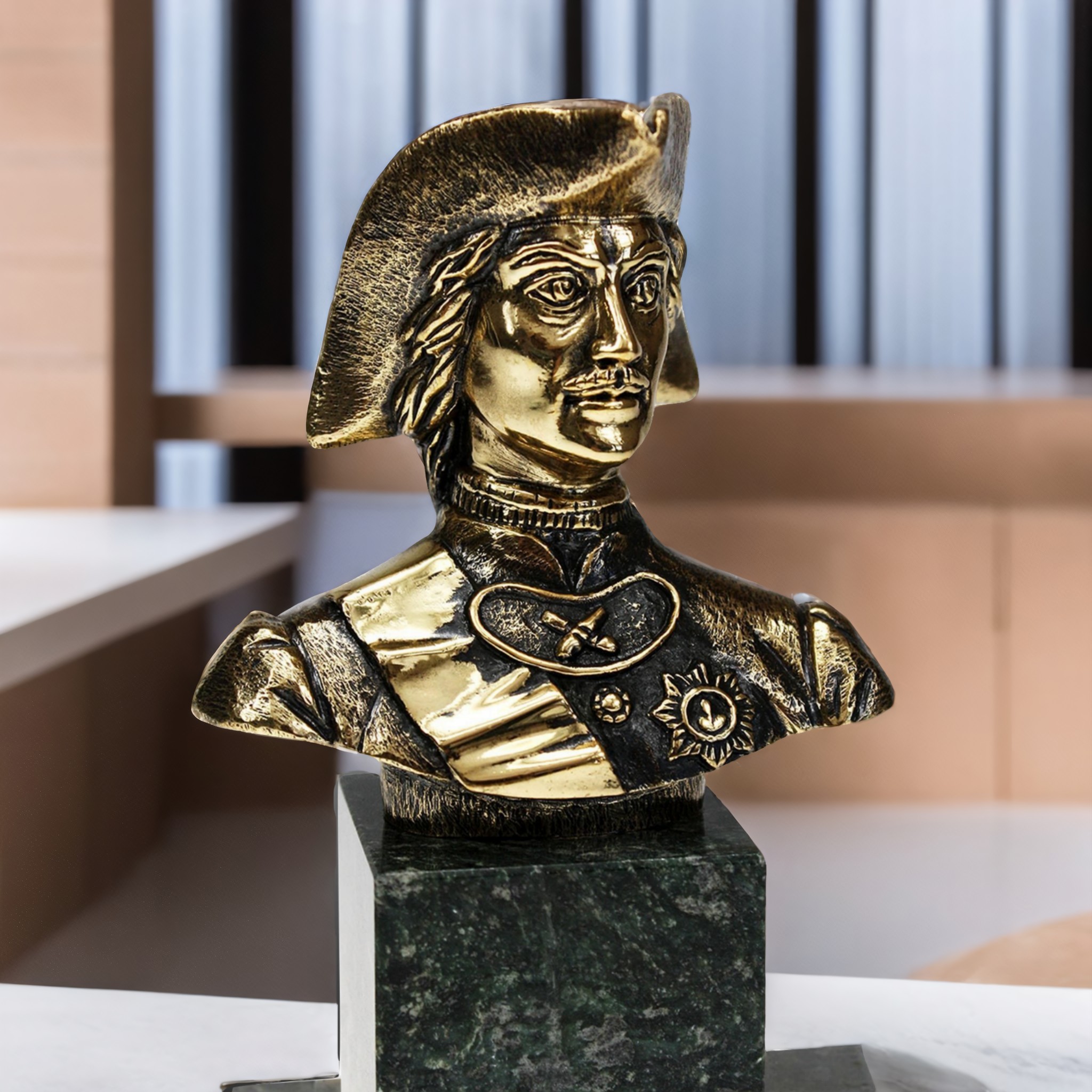 Íàø áðîíçîâûé áþñò ϸòð I ¹2 — ýòî íàñòîÿùàÿ ðàáîòà èñêóññòâà, ñîçäàííàÿ èñêóñíûìè õóäîæíèêàìè è êóçíåöàìè â ÷åñòü âåëèêîãî ðóññêîãî öàðÿ Ïåòðà I. Ïåðâûé âçãëÿä íà ýòó óíèêàëüíóþ ñêóëüïòóðó ïåðåíîñèò âàñ îáðàòíî â çîëîòóþ ýðó ðóññêîé èñòîðèè, çàòìåâàÿ ëþáóþ äðóãóþ îáû÷íóþ ñòàòóþ. Äåòàëè âåëèêîëåïíî ïðîðàáîòàíû, êàæäûé øîâ è ëèíèÿ òùàòåëüíî ïðîäóìàíû äî ìåëü÷àéøåé äåòàëè. Èçóìèòåëüíûé ñëîæíûé äèçàéí âîññîçäàåò èñòîðè÷åñêóþ àòìîñôåðó, ïðèçûâàÿ íàñ ðàçìûøëÿòü î òîì, êàêîâî áûëî ïðàâèòü âåëèêîé èìïåðèåé, ñòîëêíóòüñÿ ñ áåñêîíå÷íûìè âûçîâàìè è ïðåæäå âñåãî, áûòü ìóäðûì è òâåðäûì ëèäåðîì.