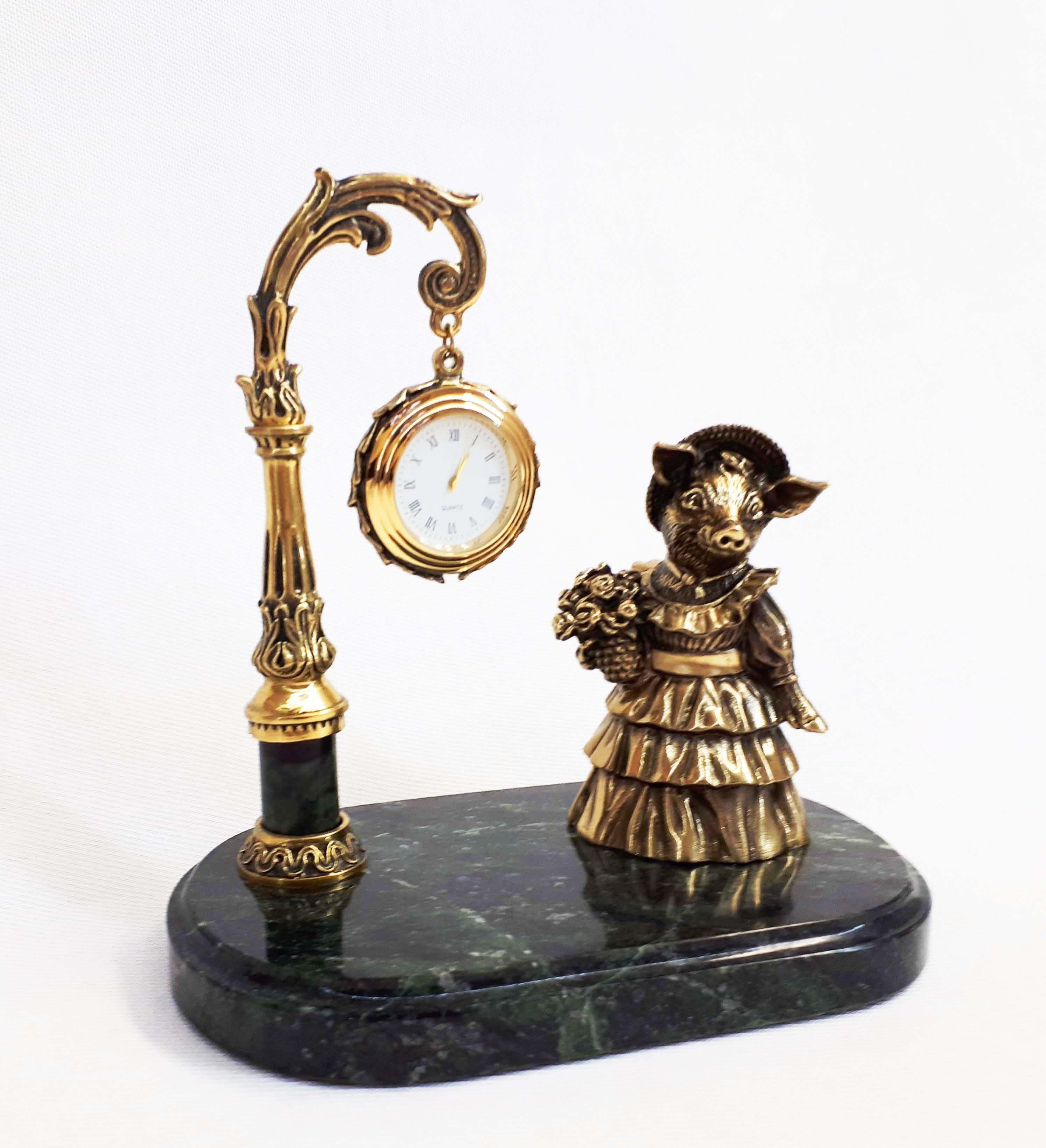 «Ñóâåíèð íàñòîëüíûå ÷àñû: ñâèíêà â ïëàòüå ñ áóêåòîì öâåòîâ íà îñíîâàíèè èç çìååâèêà ðÿäîì ñ ÷àñàìè»