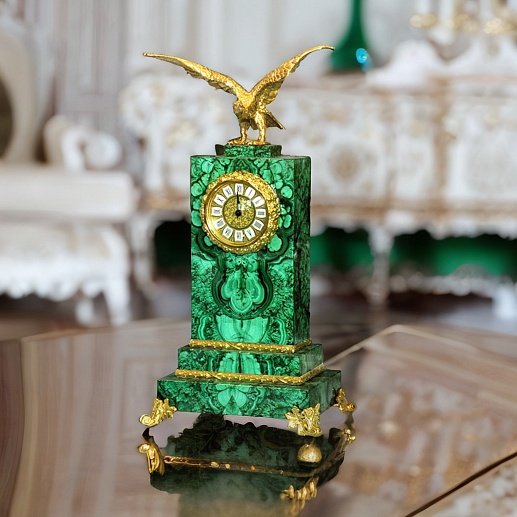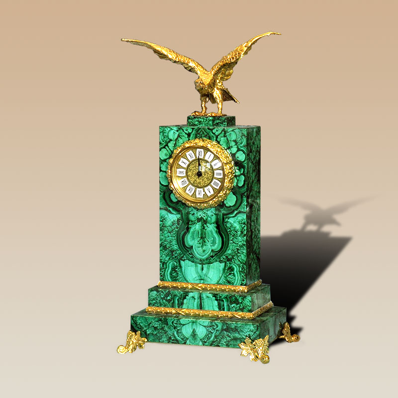 Êëàññè÷åñêèå íàñòîëüíûå ÷àñû çàéìóò äîñòîéíîå ìåñòî, êàê â òðàäèöèîííîì, òàê è â ñîâðåìåííîì èíòåðüåðå. Íàñòîÿùåé «èçþìèíêîé» ÿâëÿåòñÿ ôèãóðà Ãåîðãèÿ Ïîáåäîíîñöà, óêðàøàþùàÿ èçäåëèå (äåêîðàòèâíûé ýëåìåíò ìîæåò áûòü èçìåíåí ïî æåëàíèþ çàêàç÷èêà). Ïðèðîäíûé ðèñóíîê íàòóðàëüíîãî ìàëàõèòà îòëè÷íî ãàðìîíèðóåò ñ áëàãîðîäíîé áðîíçîé, îôîðìëåííîé â çîëîòûõ è ïëàòèíîâûõ îòòåíêàõ.