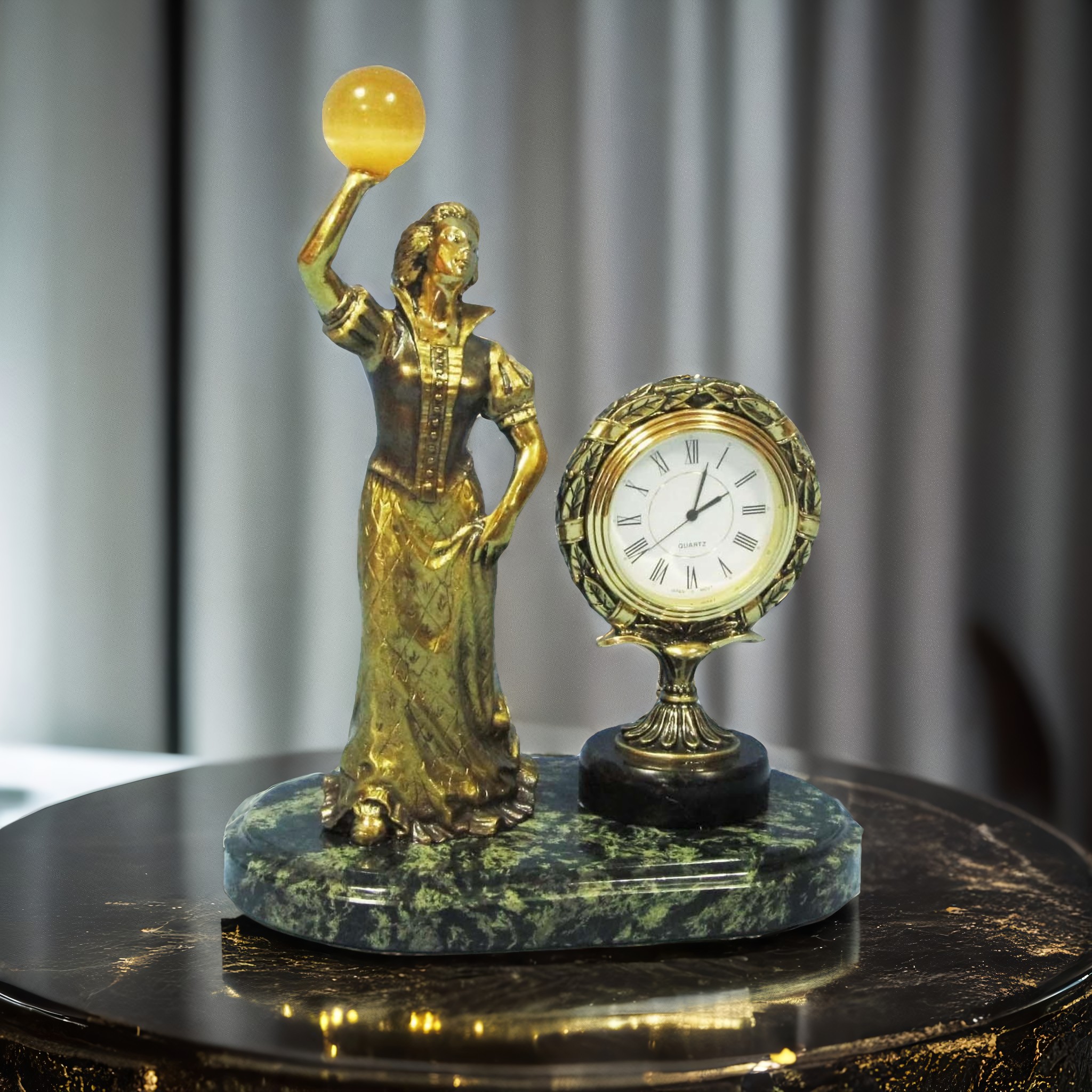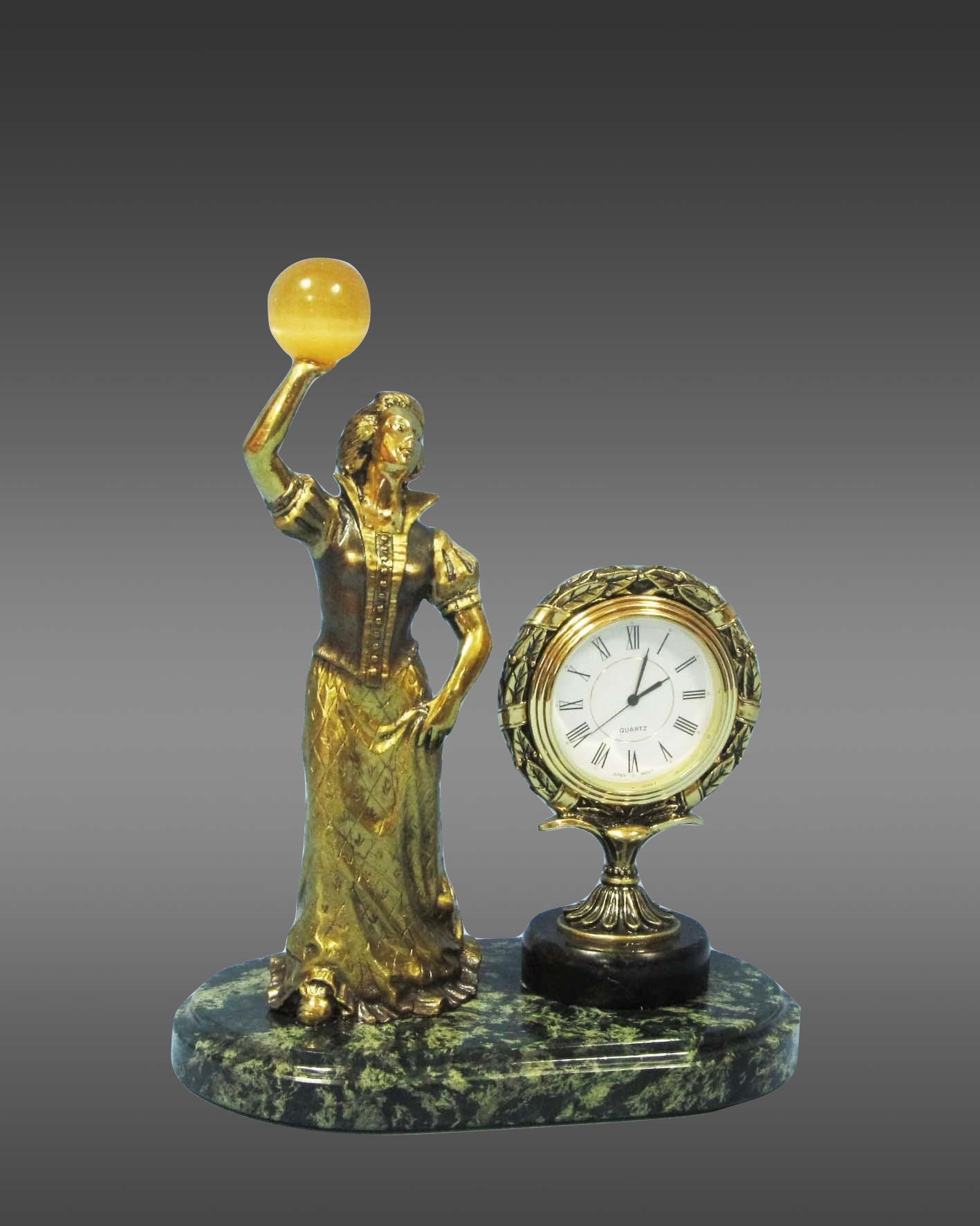 Íàñòîÿùåå ïðîèçâåäåíèå èñêóññòâà — íàñòîëüíûå ÷àñû ñ èçîáðàæåíèåì æåíùèíû, äåðæàùåé â ðóêå øàð èç êàìíÿ. Ðÿäîì ïîñòàâëåíû ýëåãàíòíûå ìèíèàòþðíûå ÷àñû. Âñå ýòî íà ïîäñòàâêå èç áëàãîðîäíîãî çìååâèêà! Ñîâåðøåíñòâî â äåòàëÿõ