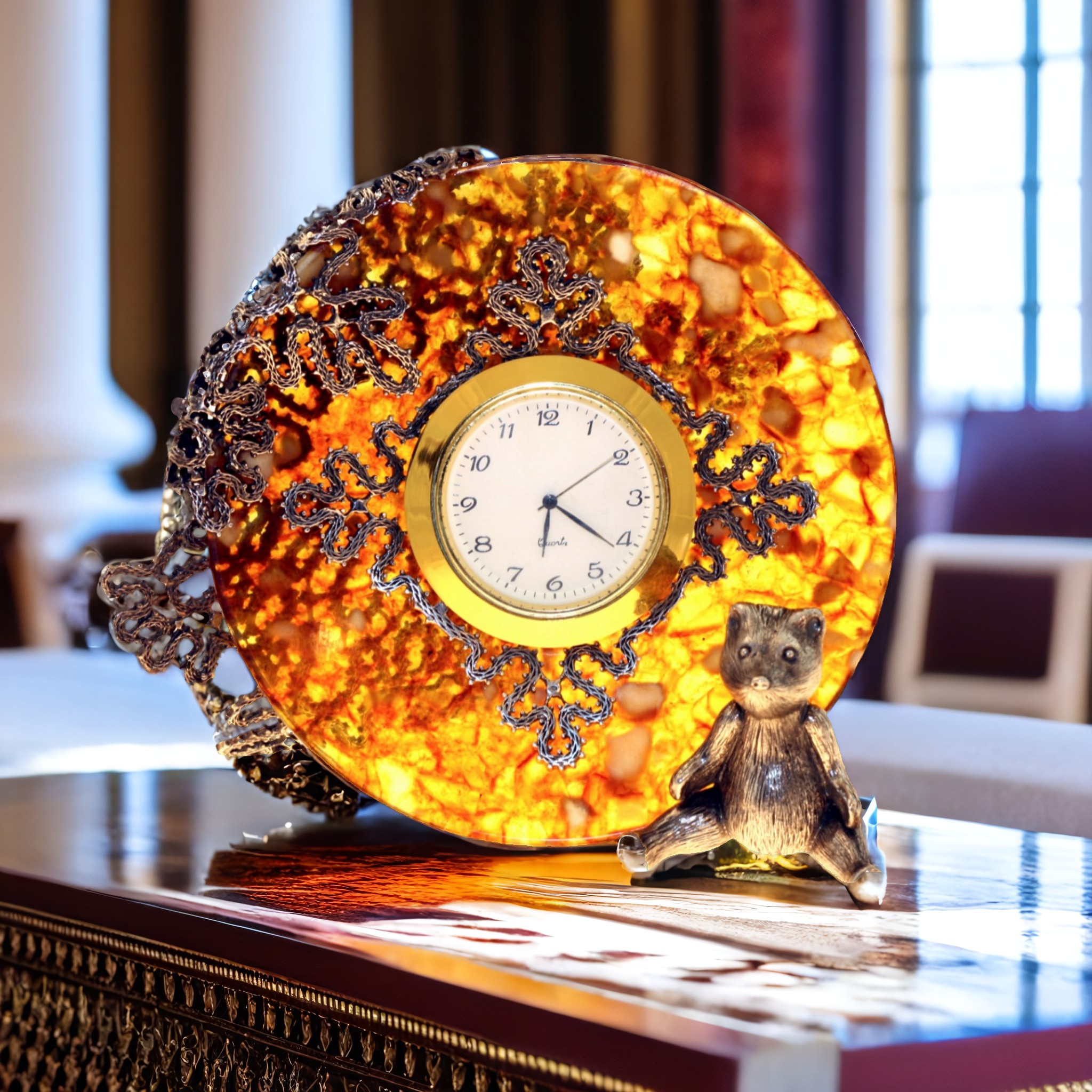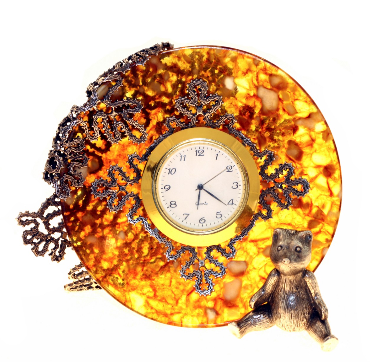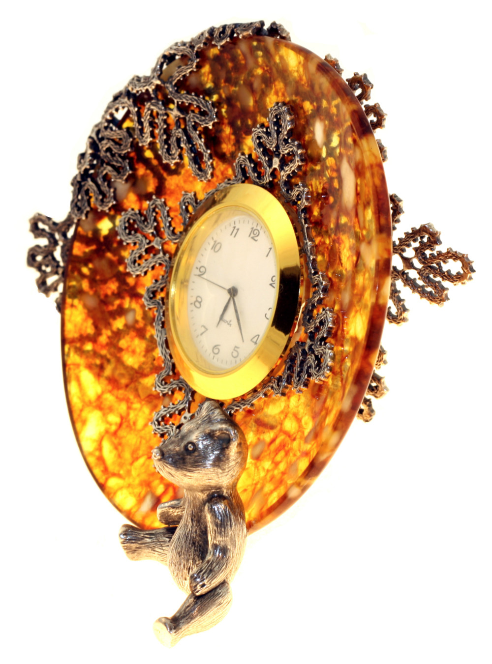 Îçàðèòå ñâîé äîì ñèÿíèåì åñòåñòâåííîãî êàìíÿ, âîïëîùåííîãî â óíèêàëüíûõ íàñòåííûõ ÷àñàõ èç ÿíòàðÿ. Ðîñêîøíûé åñòåñòâåííûé ÿíòàðü, ñòàâøèé îñíîâîé ýòèõ ÷àñîâ, îòòåíÿåò èçûñêàííûå áðîíçîâûå ýëåìåíòû â âèäå ìåäâåæîíêà, äîáàâëÿÿ óþòó è òåïëîòû â èíòåðüåð. Òàêîé àêñåññóàð ñòàíåò öåíòðîì âíèìàíèÿ â ëþáîì äîìå, îðãàíè÷íî âïèñûâàÿñü â èíòåðüåð ãîñòèíîé, ñïàëüíè, êàáèíåòà èëè äàæå äåòñêîé êîìíàòû. Ìåäâåæîíîê èç áðîíçû, èçÿùíî óêðàøàþùèé ÷àñû, íåäâóñìûñëåííî íàìåêàåò íà ëþáîâü ê ïðèðîäå, âíèìàíèå ê äåòàëÿì è áåçóïðå÷íûé âêóñ âëàäåëüöà.