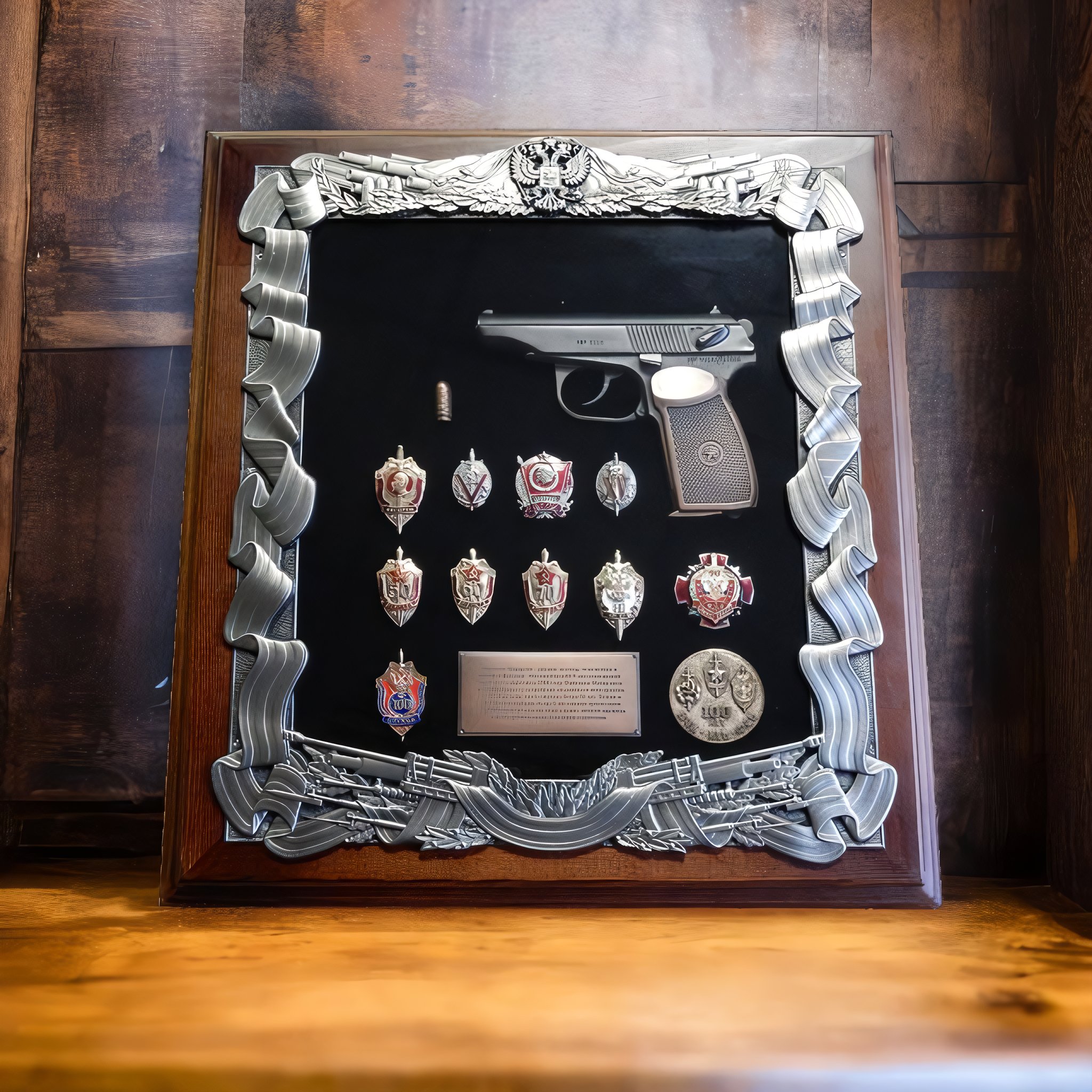 Äåðåâÿííàÿ êëþ÷íèöà ñ ïèñòîëåòîì Ìàêàðîâà è çíàêàìè ÔÑÁ