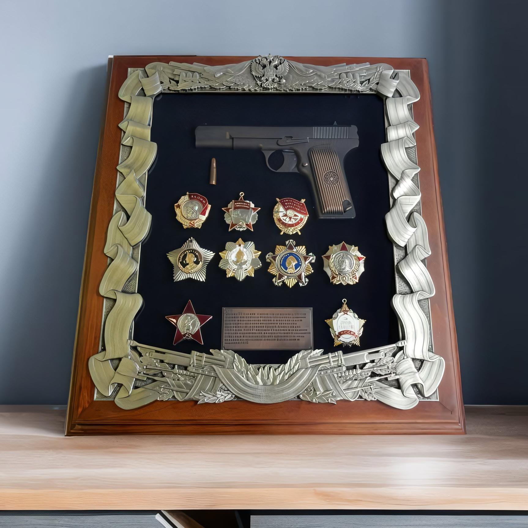 Äåðåâÿííàÿ íàñòåííàÿ êëþ÷íèöà ñ ïèñòîëåòîì ÒÒ è íàãðàäàìè ÑÑÑÐ – õîðîøèé âûáîð äëÿ ïîïîëíåíèÿ àññîðòèìåíòà ìàãàçèíà ïîäàðêîâ. Èçäåëèÿ òàêîãî òèïà áóäóò øèðîêî âîñòðåáîâàíû â êà÷åñòâå êîðïîðàòèâíûõ ïðåçåíòîâ ëþäÿì, äåÿòåëüíîñòü êîòîðûõ ñâÿçàíà ñ Âîîðóæåííûìè ñèëàìè èëè ñèëîâûìè ñòðóêòóðàìè.