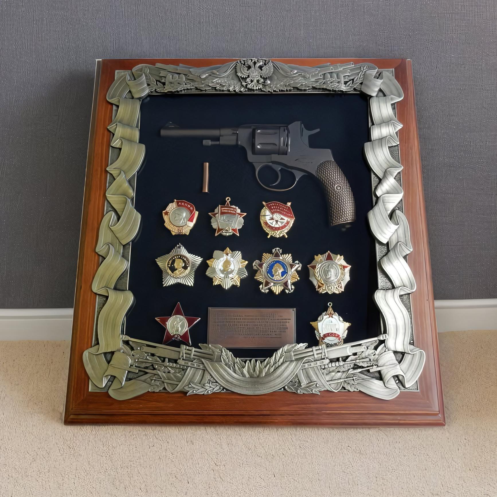 Äåðåâÿííàÿ êëþ÷íèöà ñ ðåâîëüâåðîì Íàãàí è íàãðàäàìè ÑÑÑÐ