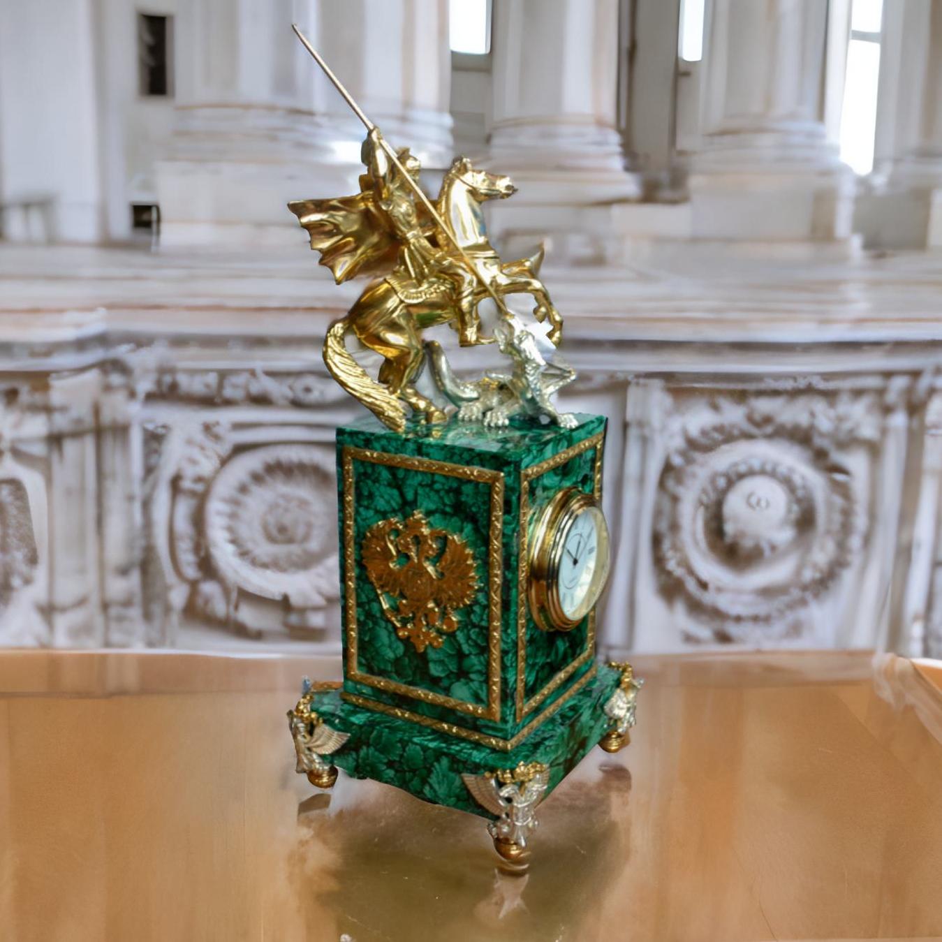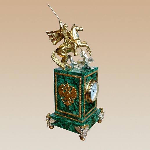 Ñîëèäíûå íàñòîëüíûå ÷àñû ãàðìîíè÷íî âïèøóòñÿ, êàê â æèëîå, òàê è â îôèñíîå ïðîñòðàíñòâî. Èçäåëèå óêðàøåíî ñîëèäíîé ôèãóðîé Ãåîðãèÿ Ïîáåäîíîñöà – ñèìâîëà ìóæåñòâà è ðåøèòåëüíîñòè. Ýôôåêòíîñòè îáðàçöó äîáàâëÿåò òî, ÷òî äåòàëè èç ÷èñòîé áðîíçû îôîðìëåíû â ðàçíûõ îòòåíêàõ – îò çîëîòà äî ïëàòèíû.