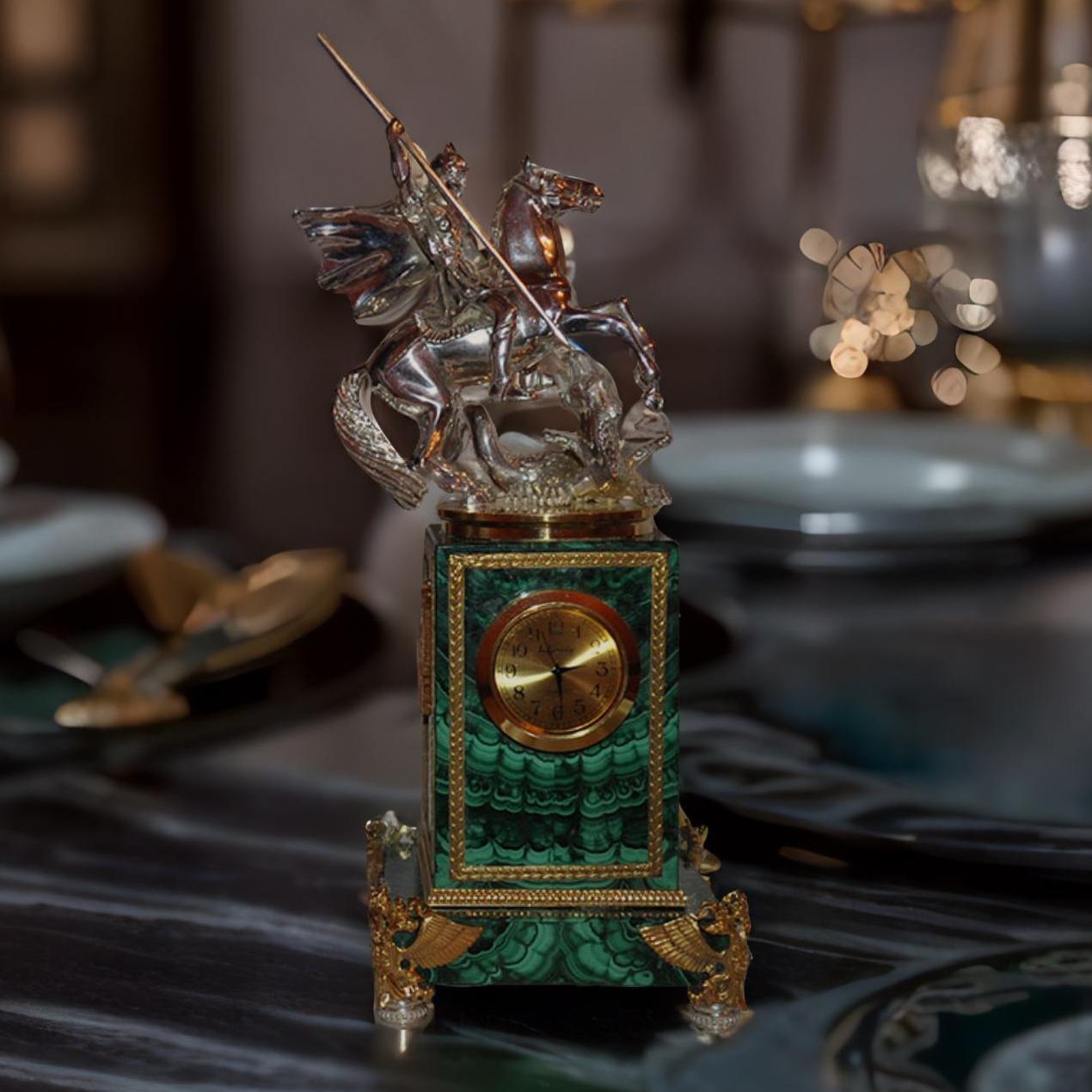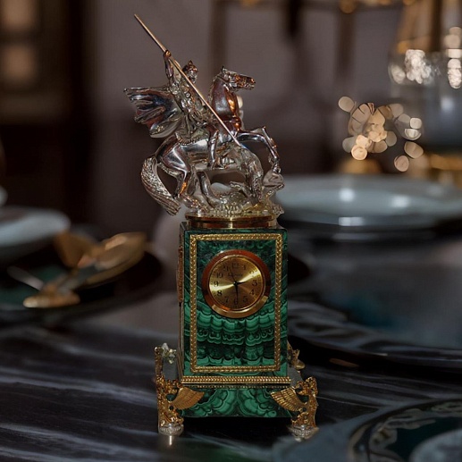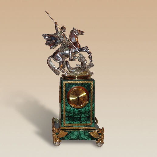 Ñîëèäíûå íàñòîëüíûå ÷àñû ãàðìîíè÷íî âïèøóòñÿ, êàê â æèëîå, òàê è â îôèñíîå ïðîñòðàíñòâî. Èçäåëèå óêðàøåíî ñîëèäíîé ôèãóðîé Ãåîðãèÿ Ïîáåäîíîñöà – ñèìâîëà ìóæåñòâà è ðåøèòåëüíîñòè. Ýôôåêòíîñòè îáðàçöó äîáàâëÿåò òî, ÷òî äåòàëè èç ÷èñòîé áðîíçû îôîðìëåíû â ðàçíûõ îòòåíêàõ – îò çîëîòà äî ïëàòèíû.