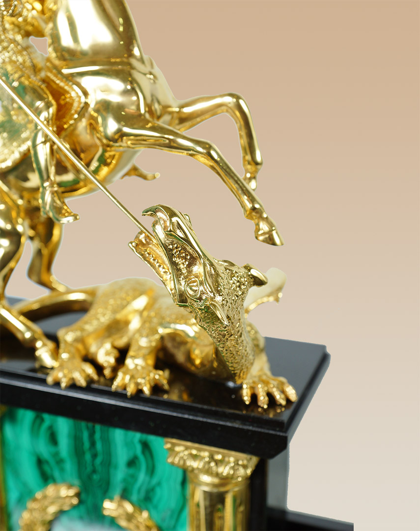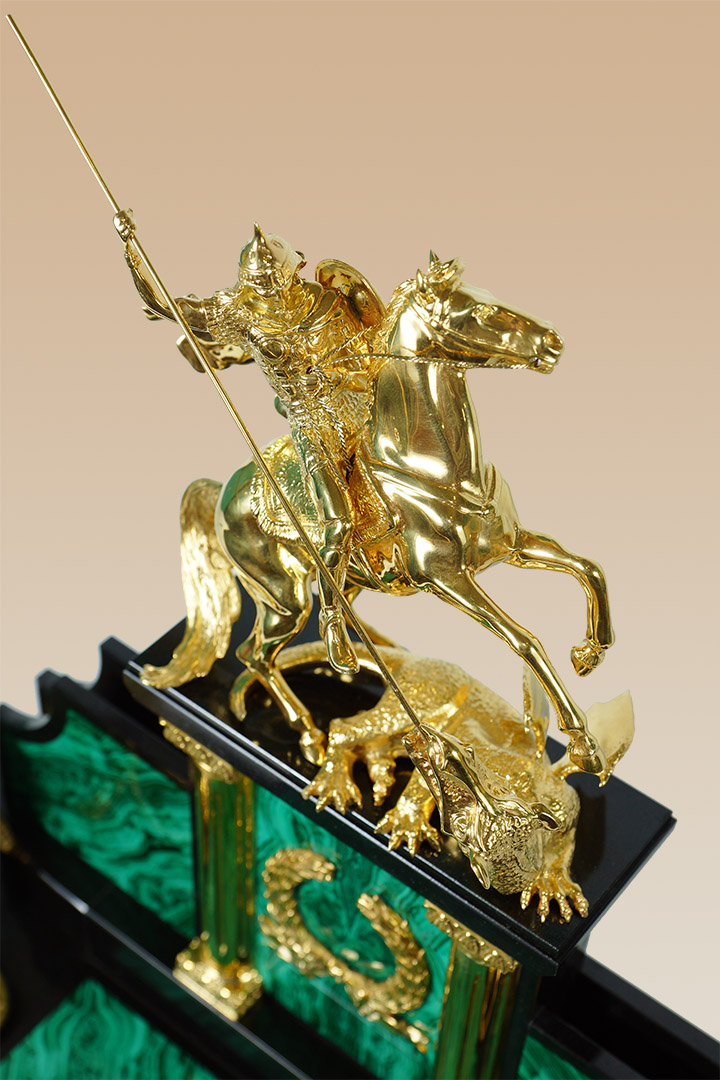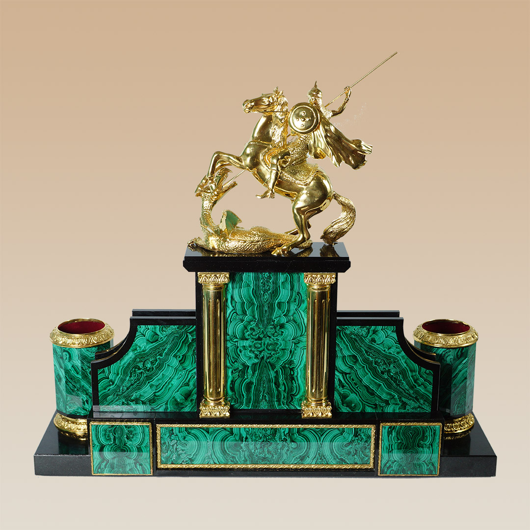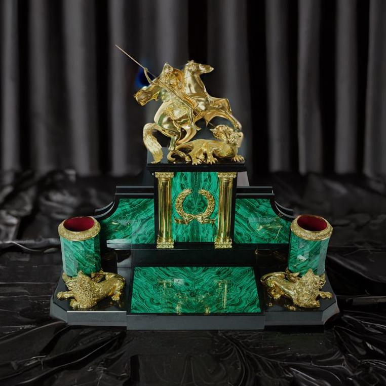 Ïèñüìåííûé íàáîð èçãîòîâëåí èç íàòóðàëüíîãî ìàëàõèòà, â êà÷åñòâå äåêîðà âûñòóïàþò ýëåìåíòû èç áðîíçû, àíîäèðîâàííûå ïîä çîëîòî. Öåíòðàëüíûé ýëåìåíò êîíñòðóêöèè — Ãåîðãèé Ïîáåäîíîñåö, ïîáåæäàþùèé êîïüåì çìåÿ; îí ñèìâîëèçèðóåò ñìåëîñòü è ðåøèòåëüíîñòü. Íàáîð ñ ïîäñòàâêîé äëÿ òåëåôîíà ïðåêðàñíî ïîäîéäåò äëÿ óñïåøíîé, ïëîäîòâîðíîé ðàáîòû. |