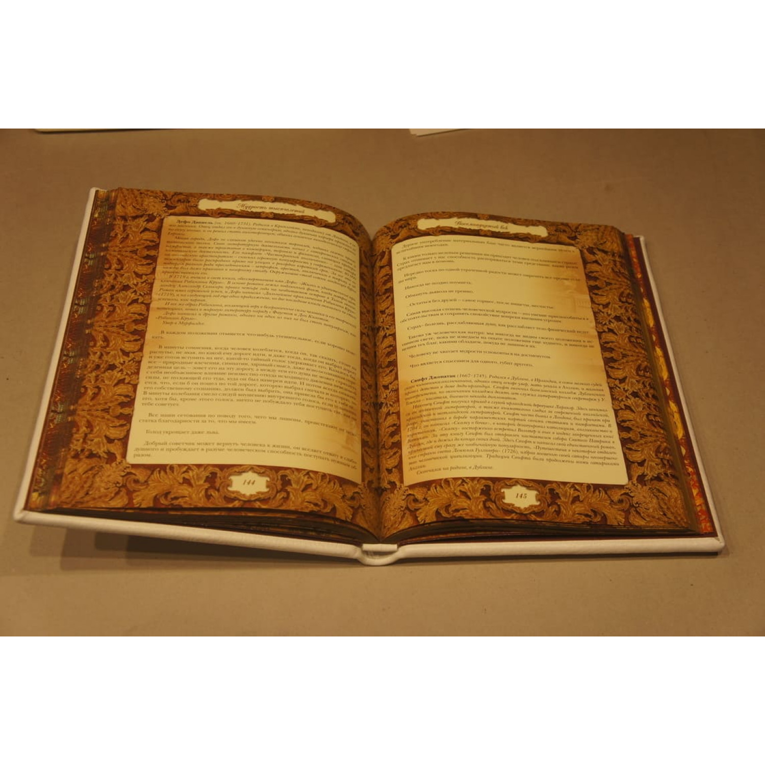 Êíèãà «Ìóäðîñòü òûñÿ÷åëåòèé» - íàñòîÿùàÿ ýíöèêëîïåäèÿ, â íåé âû ñìîæåòå àáñîëþòíî âñå ñàìûå èçâåñòíûå àôîðèçìû è èçðå÷åíèÿ, áëàãîäàðÿ êîòîðûì âàøà æèçíü ïîëíîñòüþ èçìåíèòñÿ. Èñïîëüçóéòå èõ êàæäûé äåíü, òâîðèòå ñâîþ èñòîðèþ è ñ÷àñòëèâîå áóäóùåå, ïîëüçóéòåñü öåííûìè ñîâåòàìè èçâåñòíûõ ëþäåé.  êíèãå åñòü àôîðèçìû, êîòîðûå áûëè íàïèñàíû íåñêîëüêî âåêîâ íàçàä, à òàêæå áîëåå ñîâðåìåííûå (20 âåê). Àâòîðû èçðå÷åíèé – âñåì èçâåñòíûå ïèñàòåëè, èñòîðèêè, çíàìåíèòûå ôèëîñîôû, îíè íàâñåãäà îñòàâèëè ñâîé ñëåä â èñòîðèè. Êðîìå àôîðèçìîâ, íà ñòðàíèöàõ âû óâèäèòå èíôîðìàöèþ î áèîãðàôèè ýòèõ âåëèêèõ ëþäåé, êîòîðûå äåëÿòñÿ ñ âàìè îïûòîì è çíàíèÿìè, ïîýòîìó âû ñìîæåòå óçíàòü î òîì, êàê îíè æèëè è êàêèå ñîáûòèÿ èì ïðèøëîñü ïåðåæèòü. «Ìóäðîñòü òûñÿ÷åëåòèé» ïîäàðî÷íîå èçäàíèå èçãîòîâëåíî âðó÷íóþ ëèìèòèðîâàííûì òèðàæîì, îáëîæêà óêðàøåíà òèñíåíèåì è îáðåçîì çîëîòèñòîãî öâåòà, òåêñò è èëëþñòðàöèè íàïå÷àòàíû íà êà÷åñòâåííîé ìåëîâàííîé áóìàãå. Íàêëàäêà : ïëàñòèê ãðàâèðîâêà, ìåëîâàííàÿ áóìàãà, 308 ñòð |