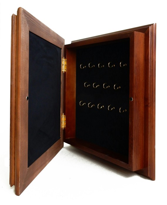 Ïðè èçãîòîâëåíèè íàñòåííîé êëþ÷íèöû èñïîëüçîâàëàñü ãàëüâàíîïëàñòèêà. Âíóòðåííÿÿ ÷àñòü îòäåëàíà áàðõàòîì è ïðåäíàçíà÷åíà äëÿ õðàíåíèÿ êëþ÷åé, äëÿ ýòîãî âíóòðè êëþ÷íèöû íàõîäÿòñÿ îäèííàäöàòü êðþ÷êîâ. Íà êðûøêå êëþ÷íèöû íàõîäèòñÿ ìàãíèò, êðûøêà êðåïèòñÿ ê îñíîâàíèþ ïðè ïîìîùè äâóõ ëàòóííûõ ïåòåëü, íà çàäíåé ñòîðîíå íàõîäÿòñÿ ïîäâåñû äëÿ êðåïëåíèÿ íà ñòåíó. Íàñòåííàÿ êëþ÷íèöà âûïîëíåíà ñ áîëüøèì õóäîæåñòâåííûì âêóñîì è â òî æå ñàìîå âðåìÿ èìååò ïðàêòè÷åñêîå çíà÷åíèå. |