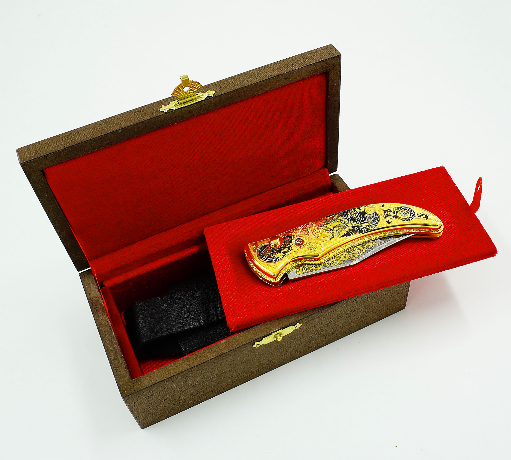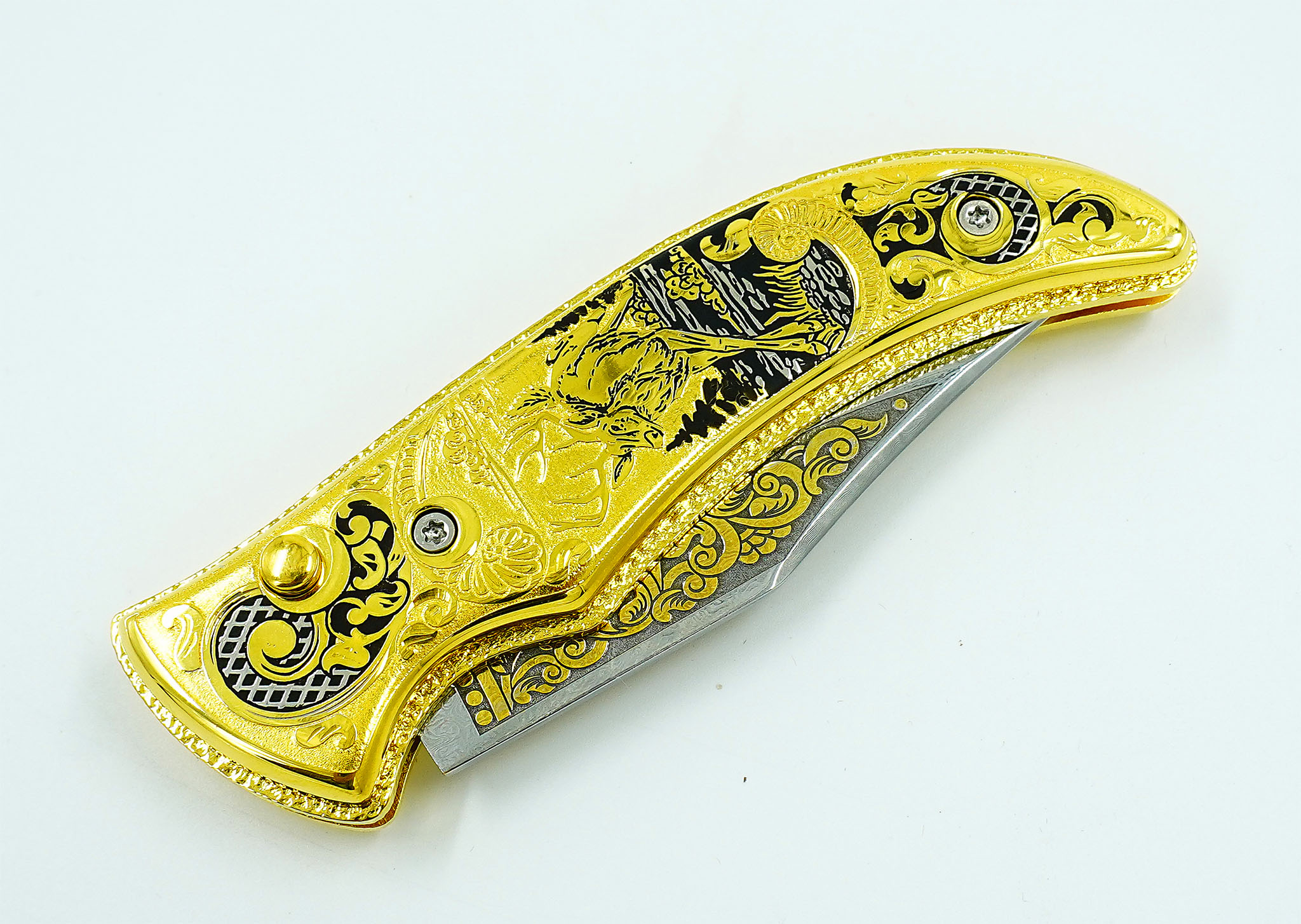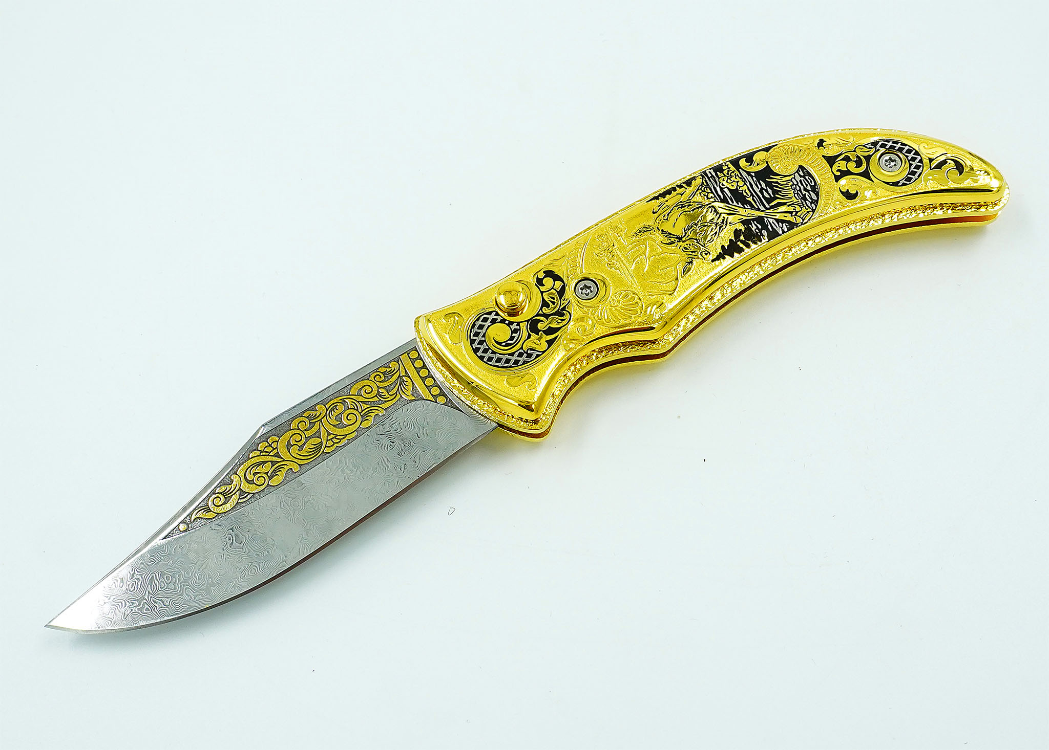 Ïðåâîñõîäíûé íîæ ñêëàäíîé äàìàññêèé Îëåíü îòëè÷íî ñî÷åòàåò â ñåáå êðàñîòó è ôóíêöèîíàëüíîñòü. Èçãîòîâëåííûé ïî óíèêàëüíîé òåõíîëîãèè çëàòîóñòîâñêîé ãðàâþðû ñ çîëî÷åíèåì, ýòîò ïðåäìåò ïðèíåñåò ðàäîñòü è óäîâîëüñòâèå îò åãî âëàäåíèÿ. Ãðàâèðîâêà èçîáðàæåíèÿ îëåíÿ, âûïîëíåííàÿ ñ âûñîêîé ñòåïåíüþ ìàñòåðñòâà, äåëàåò íîæ íå òîëüêî ïîëåçíûì èíñòðóìåíòîì, íî è óíèêàëüíûì ïðåäìåòîì èñêóññòâà, êîòîðûé ìîæíî ïî äîñòîèíñòâó îöåíèòü, ïðèñìîòðåâøèñü ê íåìó ïîáëèæå.