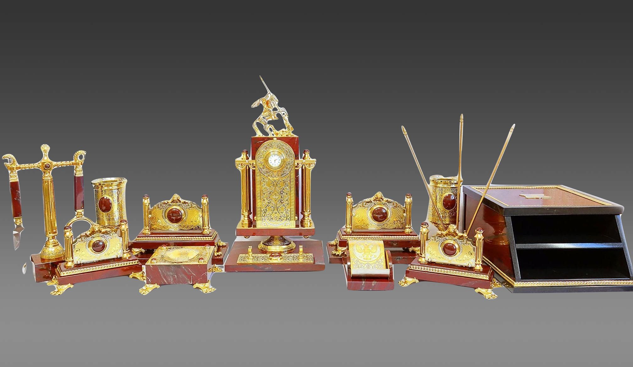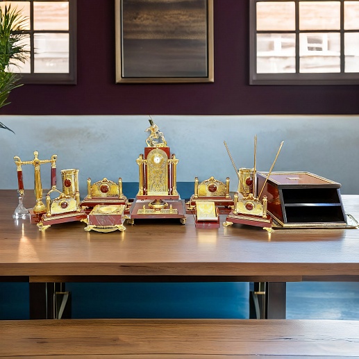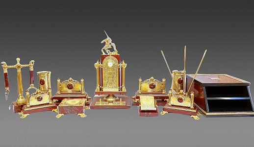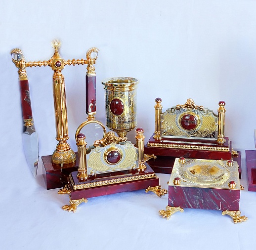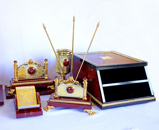 Ïèñüìåííûé íàáîð "ßøìîâûé" èç Çëàòîóñòà – ýòî âûðàçèòåëüíîå ñî÷åòàíèå ïðàêòè÷íîñòè è ýëåãàíòíîñòè. Ýòîò íàñòîëüíûé ïèñüìåííûé íàáîð, âûïîëíåííûé èç êðàñíîé ÿøìû, óêðàøåí çëàòîóñòîâñêîé ãðàâþðîé è õóäîæåñòâåííûì ëèòüåì. Ïðåäñòàâëÿåò ñîáîé èäåàëüíûé ïîäàðîê äëÿ ëþáîãî ïðîôåññèîíàëà èëè ó÷åíîãî, öåíÿùåãî êðàñîòó è óíèêàëüíîñòü â äåòàëÿõ ñâîåãî ðàáî÷åãî ïðîñòðàíñòâà. Âåñüìà ïðàêòè÷åí äëÿ òåõ, êòî ïðîâîäèò ìíîãî âðåìåíè çà ñòîëîì, ïèøåò èëè ðóêîâîäèò. Òàêîé ïîäàðîê ïîä÷åðêíåò óòîí÷åííûé âêóñ åãî âëàäåëüöà è ñòàíåò ÿðêèì ýëåìåíòîì èíòåðüåðà. |