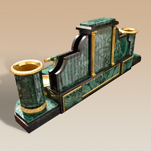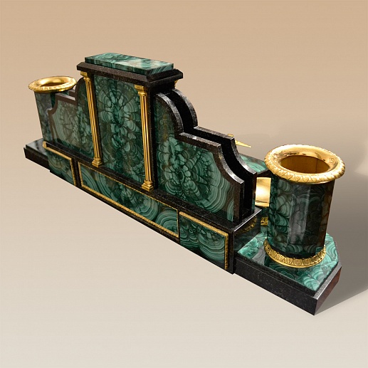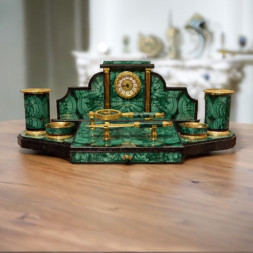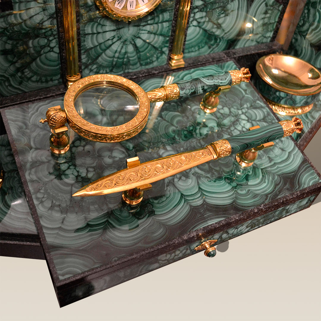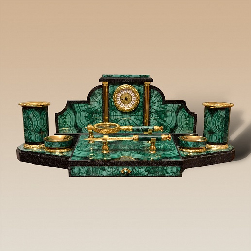 Ïèñüìåííûé íàáîð èç ìàëàõèòà ñòàíåò ïðåêðàñíûì ïîäàðêîì äëÿ äåëîâîãî, ñîëèäíîãî ÷åëîâåêà. Çäåñü åñòü è íàñòîëüíûå ÷àñû, è ïîäñòàâêè äëÿ êàíöòîâàðîâ, íî âíèìàíèå ñðàçó ïðèâëåêàþò ðîñêîøíàÿ ëóïà è ýôôåêòíûé íîæ äëÿ áóìàãè.  êà÷åñòâå ìàòåðèàëîâ èñïîëüçîâàíû áðîíçà è ìàëàõèò. Âñå ìåëü÷àéøèå äåòàëè ïðîðàáîòàíû î÷åíü òùàòåëüíî è áåçóêîðèçíåííî.