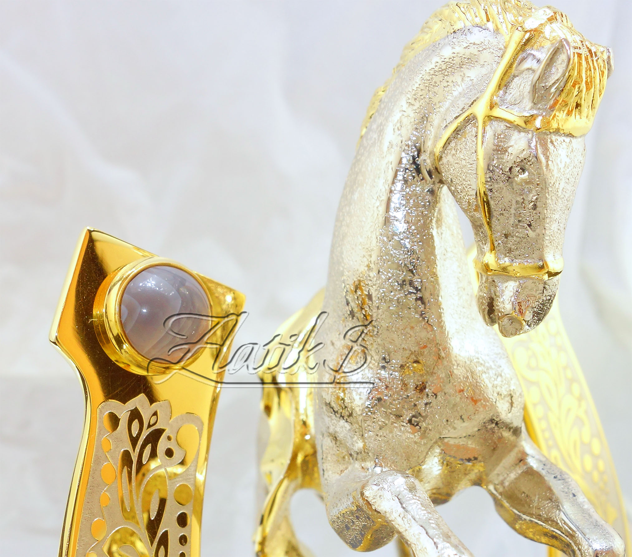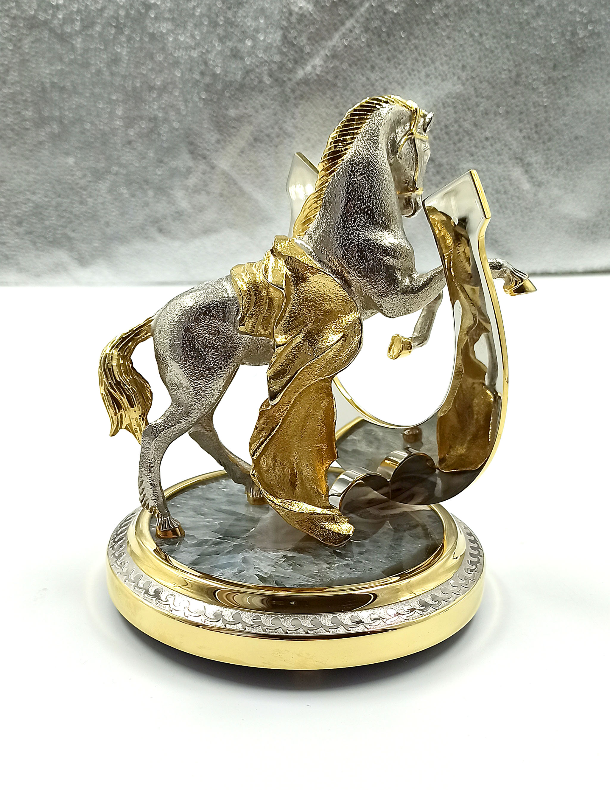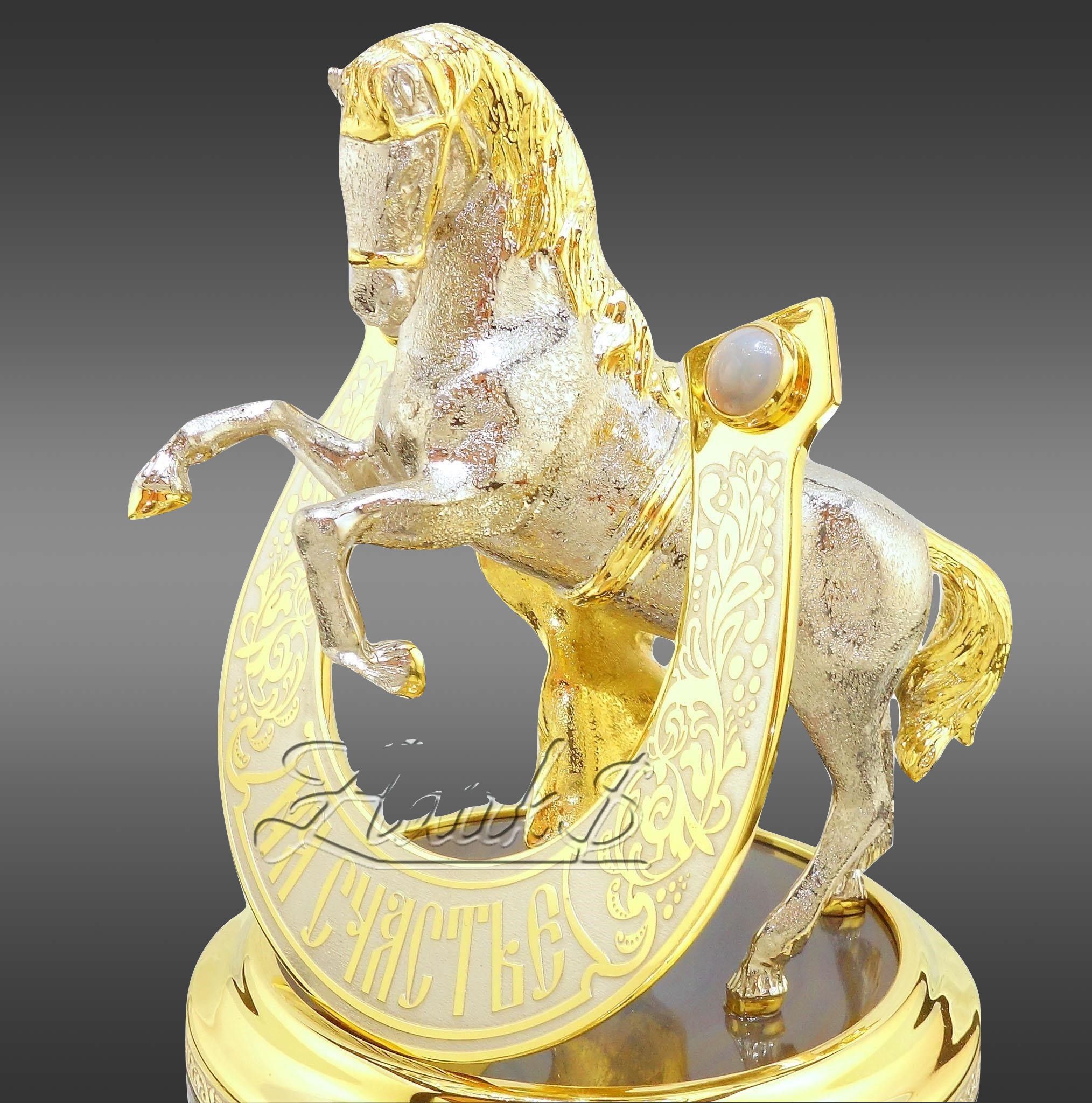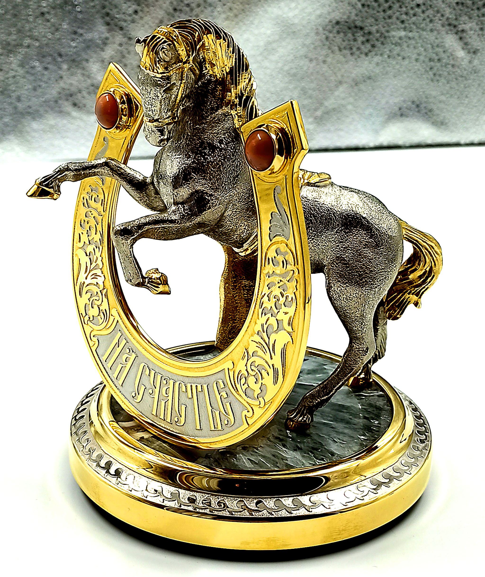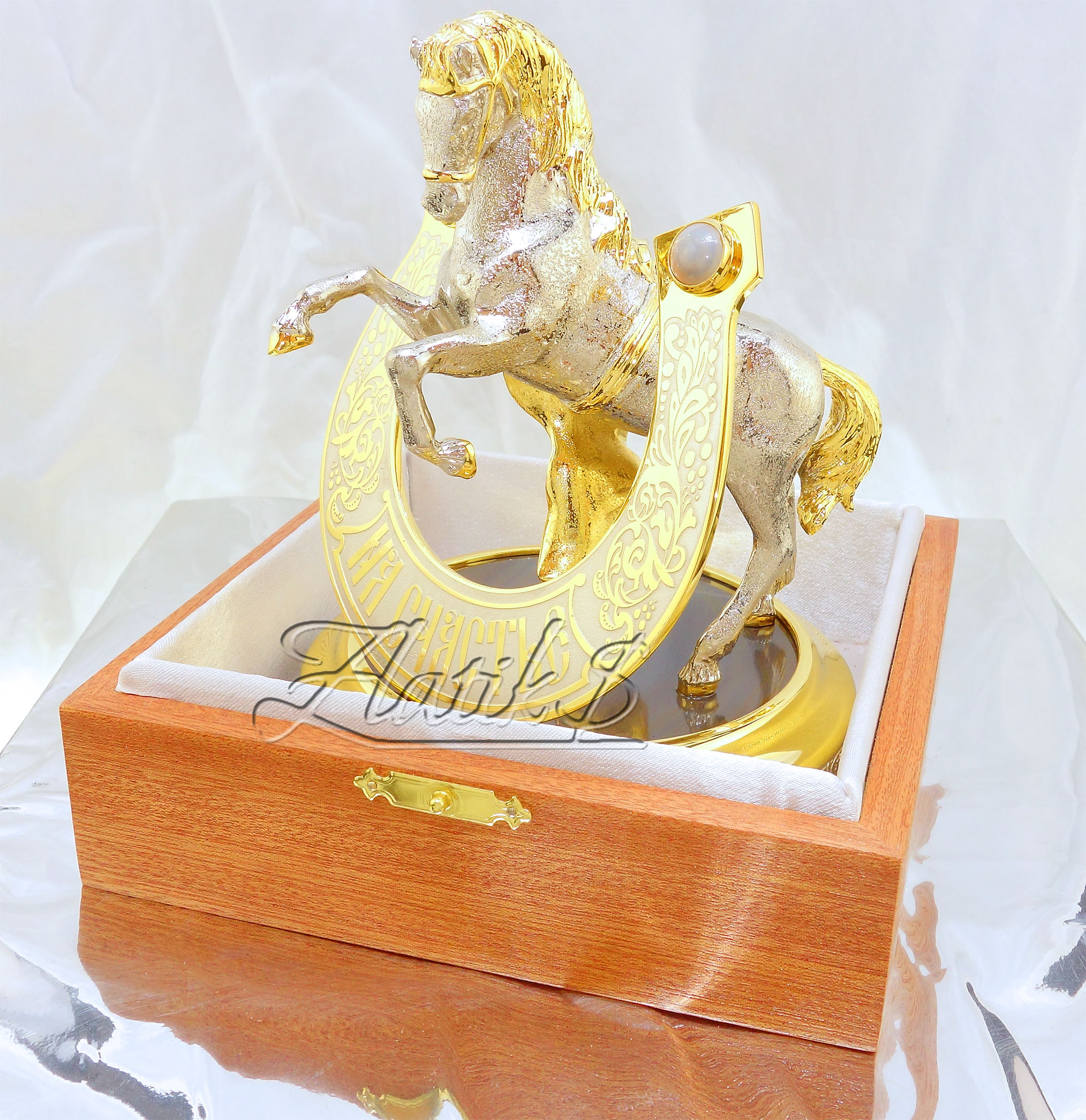 Íåñèòå ñ÷àñòüå â ñâîþ æèçíü ñ ýòîé ïîçîëî÷åííîé ïîäêîâîé, âåëèêîëåïíî óêðàøåííîé ãðàâèðîâêîé "íà ñ÷àñòüå". Íàñëàäèòåñü ýëåãàíòíîñòüþ ñòàòóýòêè êîíÿ, âûïîëíåííîé ïî òåõíîëîãèè õóäîæåñòâåííîãî ëèòüÿ èç ëàòóíè è ïîçîëî÷åííîé äëÿ äîïîëíèòåëüíîãî áëåñêà. Âñå ýòî âåëèêîëåïíî ðàñïîëîæåíî íà ïîäñòàâêå èç íàòóðàëüíîãî àãàòà, êîòîðûé äîáàâëÿåò èçûñêàííîãî øàðìà èçäåëèþ. Ýòîò óíèêàëüíûé ïðåäìåò èñêóññòâà ñî÷åòàåò â ñåáå ñèìâîëèêó ñ÷àñòüÿ è áëàãîïîëó÷èÿ, ÷òî äåëàåò åãî ïðåâîñõîäíûì âûáîðîì äëÿ óêðàøåíèÿ âàøåãî äîìà èëè â êà÷åñòâå îñîáîãî ïîäàðêà. |