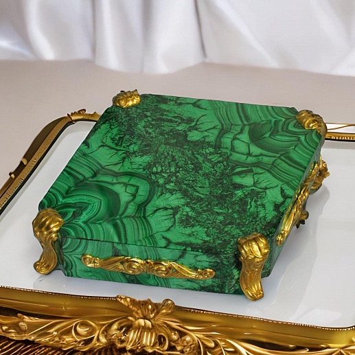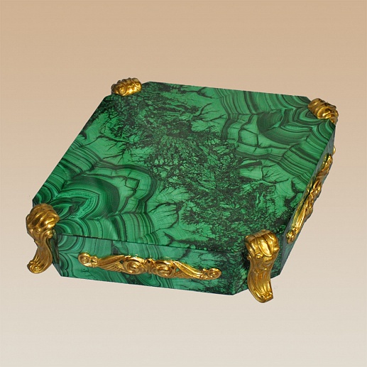 Ïîäñòàâêà ïîä ÷àñû ïðåäñòàâëÿåò ñîáîé ñîëèäíîå îñíîâàíèå ðîìáîâèäíîé ôîðìû. Èçäåëèå âûïîëíåíî èç íàòóðàëüíîãî ìàëàõèòà. Ïîäñòàâêà îïèðàåòñÿ íà îðèãèíàëüíûå, ðåçíûå íîæêè èç áðîíçû. Áîêîâûå ãðàíè àêñåññóàðà äåêîðèðîâàíû îðèãèíàëüíûìè âåíçåëÿìè. Ñî÷åòàíèå èçûñêàííîãî ìàëàõèòà è áëàãîðîäíîé áðîíçû ñìîòðèòñÿ î÷åíü ñîëèäíî è ïðåçåíòàáåëüíî.