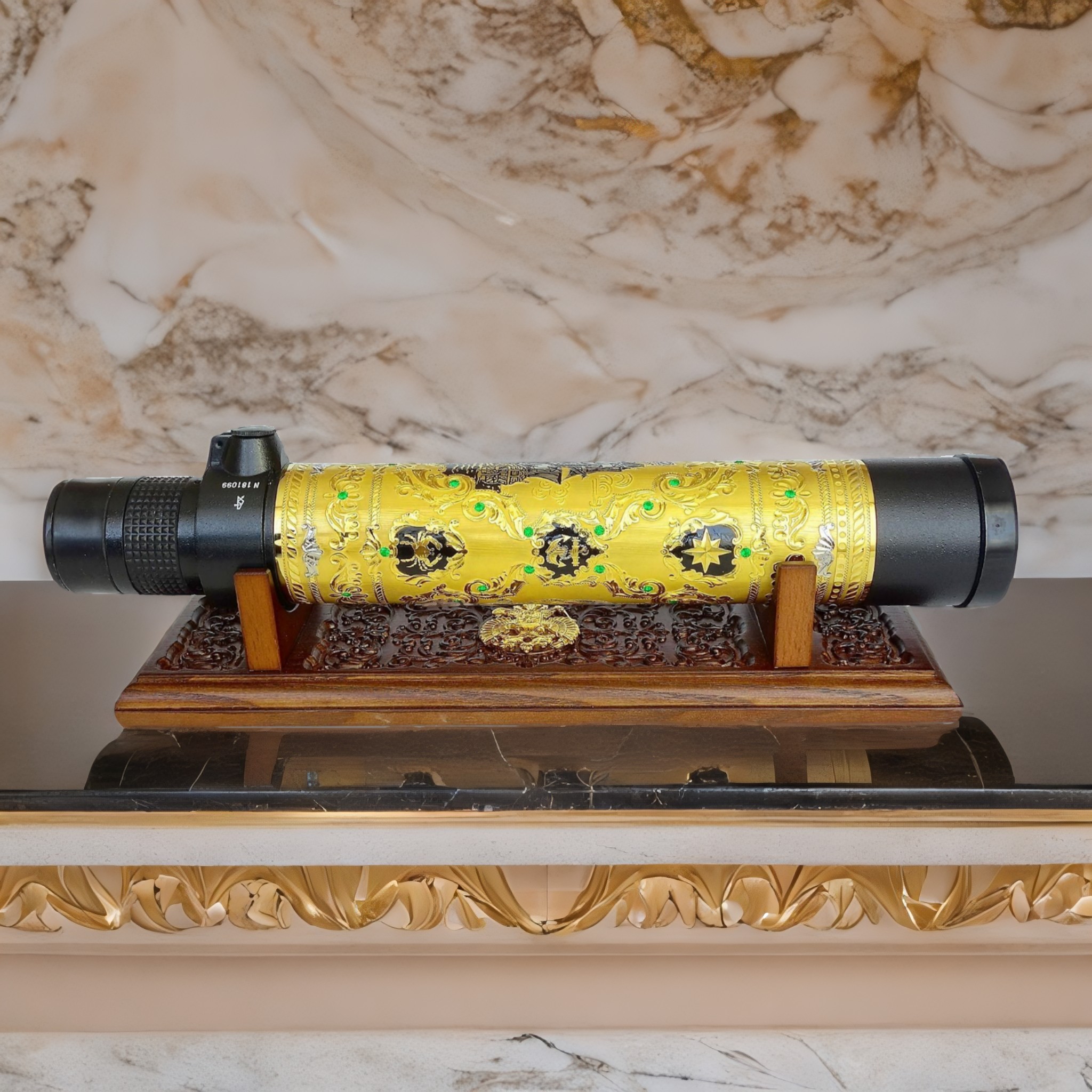 Ïîäçîðíàÿ òðóáà "Ìîðñêàÿ" èç Çëàòîóñòà - ýòî ýêñêëþçèâíûé ïîäàðîê äëÿ ëþáèòåëåé ìîðñêèõ ïóòåøåñòâèé è èñòîðèè. Òðóáà óêðàøåíà ãðàâèðîâêîé ìîðñêîé àòðèáóòèêè è èçîáðàæåíèåì êîðàáëÿ, à òàêæå âñòàâêàìè èç ôèàíèòîâ, ïðèäàþùèìè åé äîïîëíèòåëüíîãî øàðìà. Òðóáà èäåàëüíî ïîäîéäåò â êà÷åñòâå äåêîðàòèâíîãî ýëåìåíòà äëÿ êàáèíåòà, áèáëèîòåêè èëè ãîñòèíîé. Ðåçíàÿ ïîäñòàâêà ñ ëèòüåâûì ãåðáîì Ðîññèè ïîä÷åðêèâàåò ñòàòóñ è çíà÷èìîñòü ýòîãî ïðåäìåòà. |