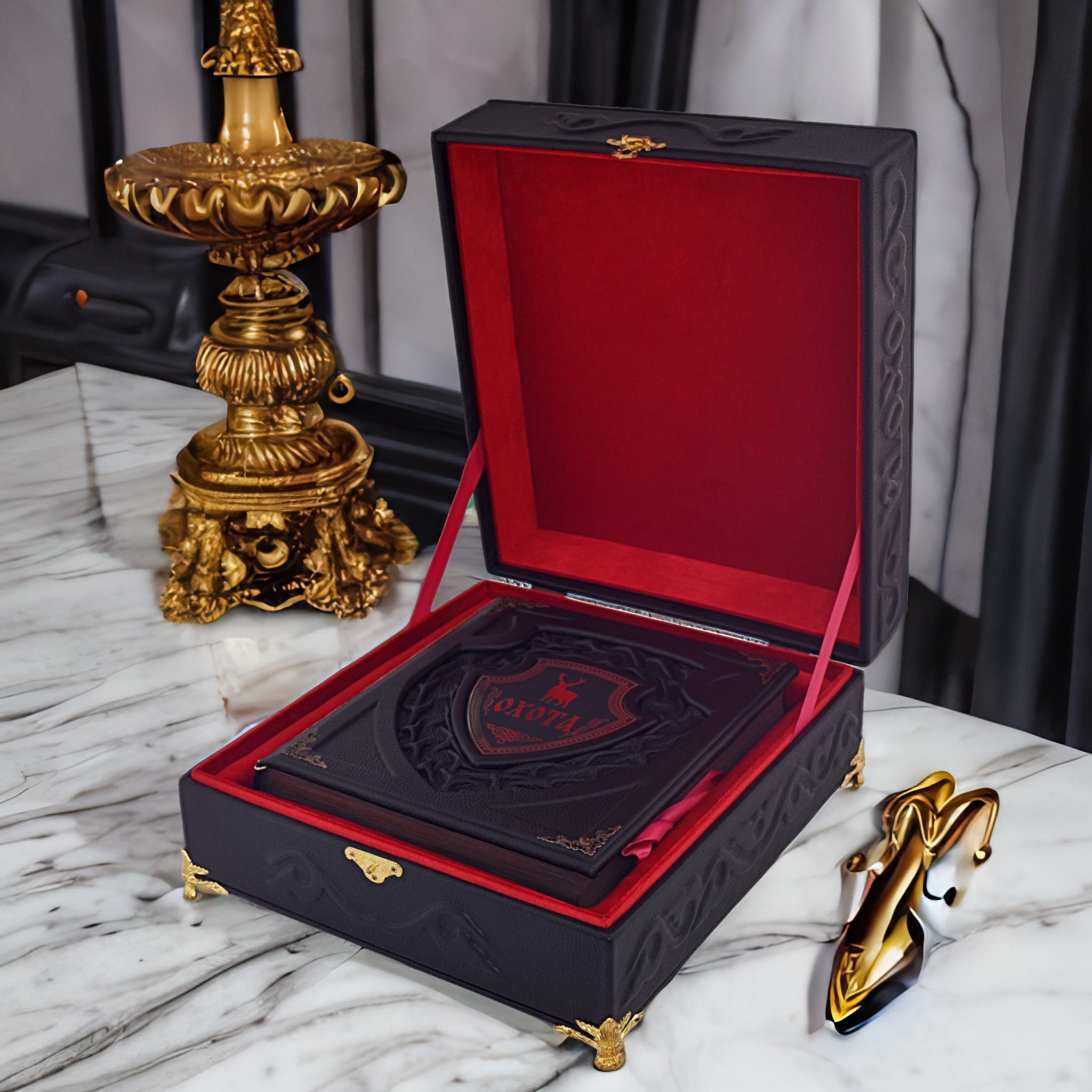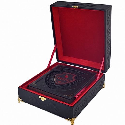 Òàêîå èçäàíèå íå ñòûäíî ïðåïîäíåñòè â êà÷åñòâå ïîäàðêà ëþáîìó, äàæå ÷åëîâåêó âûñîêîãî ñòàòóñà. Ðó÷íàÿ ðàáîòà íå èìååò ðàâíûõ ñåáå è ýòî ïðîñëåæèâàåòñÿ â êàæäîé ìåëî÷è. Öåíòðàëüíûé ýëåìåíò è òèñíåíèå ïîâòîðÿåòñÿ íà èçäàíèè è íà êîðîáå ñîçäàâàÿ îùóùåíèå åäèíñòâà êîìïîçèöèè. Îíè äåëàþò òàêóþ âûäåëêó îñîáåííî áîãàòîé, ïî-êîðîëåâñêè øèêàðíîé, èçóìèòåëüíîé. ×åòûðå òîìà êíèãè «Âåëèêîêíÿæåñêàÿ, öàðñêàÿ è èìïåðàòîðñêàÿ îõîòà íà Ðóñè» ïðåäñòàâëåíû íà ñòðàíèöàõ ïðåäñòàâëåííîãî èçäåëèÿ. Í.È. Êóòåïîâ ïðîâåë êîëîññàëüíóþ ðàáîòó, êîòîðàÿ áûëà ïåðåèçäàíà â êîëëåêöèîííîì âèäå. Òåêñò íàïèñàí â ñîîòâåòñòâèè ñ íîðìàìè ñîâðåìåííîãî ðóññêîãî ÿçûêà, ïîýòîìó êíèãà ðàññ÷èòàíà íà øèðîêèé êðóã ÷èòàòåëåé. Áîëåå ïÿòèñîò èëëþñòðàöèé ñòàëè èäåàëüíûì äîïîëíåíèåì ê ïîëåçíîé èñòîðè÷åñêîé âûæèìêå. Ýòî öåííûé èñòî÷íèê äàííûõ î êóëüòóðå îõîòû è áûòå ñòðàíû ñ äðåâíèõ âðåìåí è äî 19 âåêà. Êîðîá èçãîòàâëèâàåòñÿ èç òîé æå äîðîãîé èìïîðòíîé êîæè, ÷òî è îáëîæêà êíèãè. Òàêîé ïîäàðîê äîñòîèí ñòàòü æåì÷óæèíîé ôàìèëüíîé êîëëåêöèè êíèã. Øêàòóëêà áóäåò íàäåæíî îáåðåãàòü ñòðàíèöû îò íåãàòèâíîãî âëèÿíèÿ ïûëè è âðåìåíè. Ïðèîáðåòàÿ èçäåëèå â êîðîáå âû ïîëó÷àåòå íå÷òî áîëüøåå, ÷åì ïðîñòî êíèãó. Êëàññè÷åñêàÿ òåõíèêà âûäåëêè êîæè äåëàåò ðàáîòó óíèêàëüíîé è íåïîâòîðèìîé, ñîçäàâàåìàÿ ïî àâòîðñêîìó ýñêèçó îíà ñòàëà ýòàëîíîì ëó÷øåãî ïîäàðêà. Êîðîá: Íàêëàäêà - ãðàâèðîâêà íà ìåòàëëå . Óãîëêè , çàìîê , íîæêè - ìåòàëë îñîáîãî ñïëàâà Êíèãà: Íàêëàäêà - ãðàâèðîâêà íà ìåòàëëå |