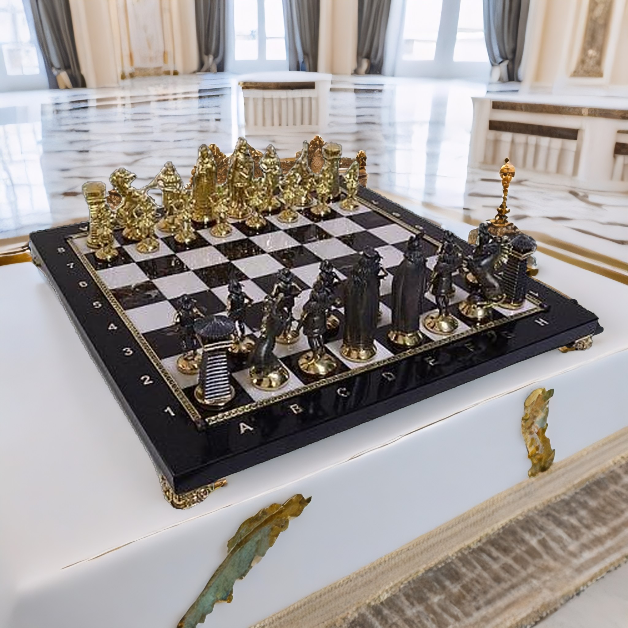 Áëàãîðîäñòâî ìàòåðèàëîâ, èñêóññòâî ðåìåñëåííèêîâ – âñå ýòî ñîøëîñü âîåäèíî â íåïðåâçîéäåííîé êðàñîòå íàøèõ Îñîáî Öåííûõ Øàõìàò. Îùóòèòå íàñêâîçü ïðîíèêàþùèé äóõ âå÷íîñòè è ãðàíäèîçíîñòè, êîãäà áåðåòå â ðóêè áðîíçîâûå ôèãóðû, òÿæåëûå è íåïîäàòëèâûå, êàê íàñòîÿùèå âîèíû. Äîñêà èç ÿøìû è äîëåðèòà, ïîðàçèòåëüíûõ êàìíåé, äàâíî çàðåêîìåíäîâàâøèõ ñåáÿ â þâåëèðíîì èñêóññòâå, äîáàâëÿåò îñîáûé øèê. Âû óâèäèòå ïëàâíûå ïåðåõîäû öâåòà îò ìîëî÷íî-çåëåíîãî äî áîãàòîãî áîðäîâîãî, îò ïëîòíî ÷åðíîãî äî òàèíñòâåííî ñèíåãî. Ýòî äåéñòâèòåëüíî ïðîèçâåäåíèå èñêóññòâà, êîòîðûì ñòîèò ãîðäèòüñÿ.
