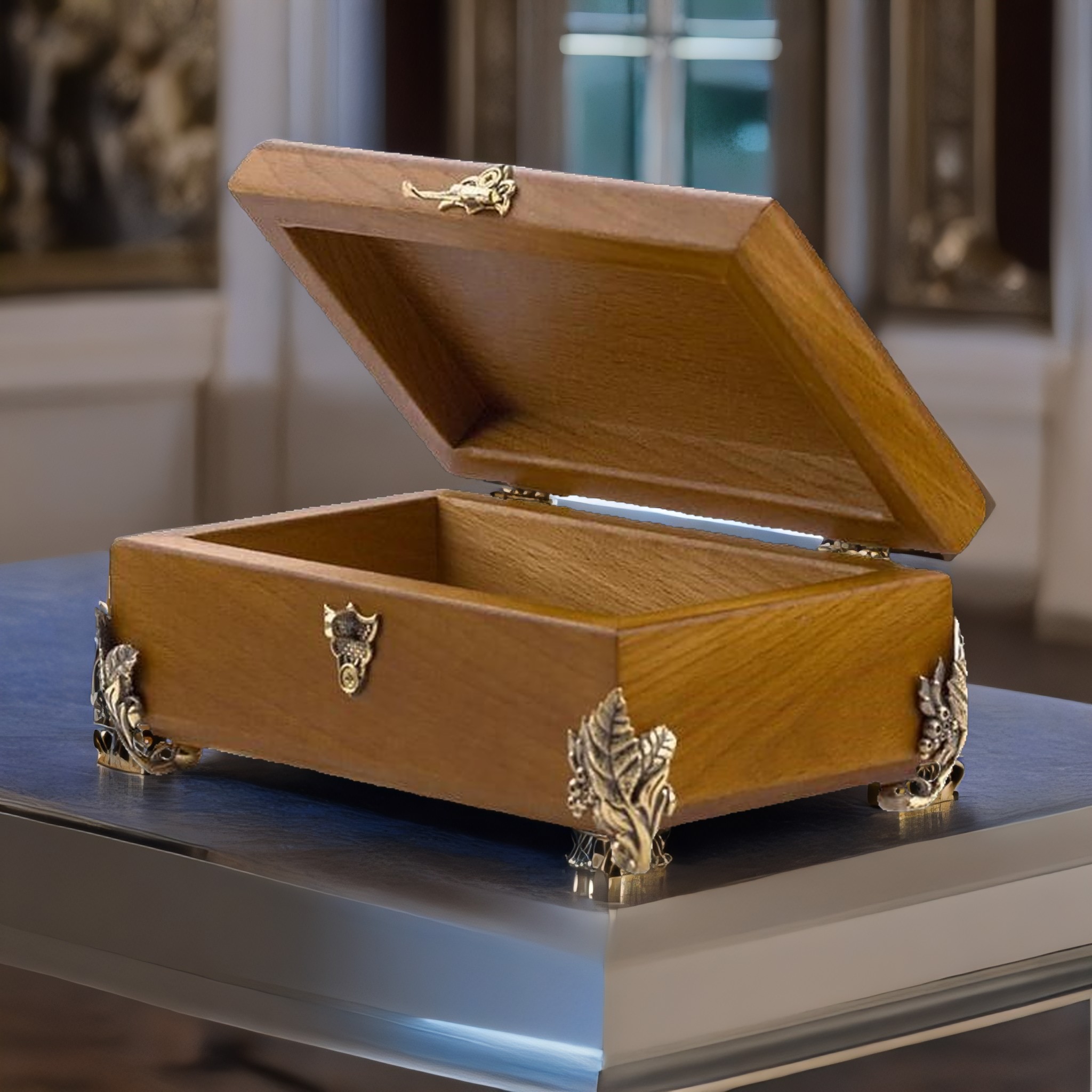 ×àñòî ìû ñòàëêèâàåìñÿ ñ ÷óâñòâîì áåñïîêîéñòâà î òîì, ãäå è êàê ëó÷øå õðàíèòü íàøè äðàãîöåííûå óêðàøåíèÿ è ìåëêèå öåííûå âåùè. Íî, ïîêóïàÿ îðèãèíàëüíóþ äåðåâÿííóþ øêàòóëêó, âû îáðåòàåòå íå òîëüêî ïðàêòè÷íîå è áåçîïàñíîå ìåñòî äëÿ õðàíåíèÿ, íî è ïðèâëåêàòåëüíûé ýëåìåíò äåêîðà. Íàøà ðó÷íàÿ ðàáîòà – ýòà äåðåâÿííàÿ øêàòóëêà îáåùàåò äîëãóþ ñëóæáó áëàãîäàðÿ ñâîåé ïðî÷íîñòè è êà÷åñòâó. Óêðàøåíà èçûñêàííûìè áðîíçîâûìè ýëåìåíòàìè, îíà ÿâëÿåòñÿ îáðàçöîì ñòèëÿ è ðîñêîøè.