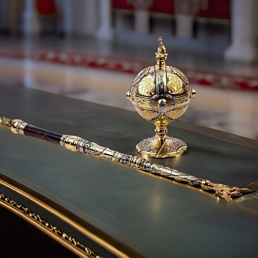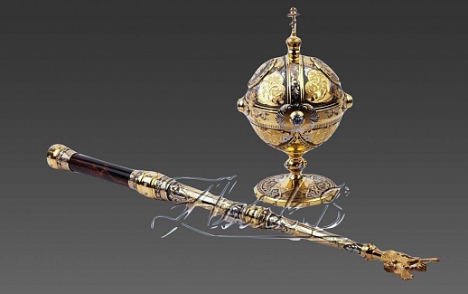 Ïîãðóçèòåñü â ýïîõó âåëèêèõ ìîíàðõîâ è ðîñêîøíûõ äâîðöîâ ñ óíèêàëüíûì ñåòîì – ñêèïåòðîì è äåðæàâîé, îáèëüíî óêðàøåííûìè ôèàíèòàìè. Ýòè ïðåäìåòû ñèìâîëèçèðîâàëè âëàñòü è ìîãóùåñòâî â äðåâíèå âðåìåíà è äî ñèõ ïîð îñòàþòñÿ âàæíûìè àòðèáóòàìè êîðîëåâñêîé âëàñòè. Ñêèïåòð è äåðæàâà âûïîëíåíû ñ íåïðåâçîéäåííûì ìàñòåðñòâîì, è êàæäûé ýëåìåíò èõ äèçàéíà – îò áëåñòÿùèõ ôèàíèòîâûõ âñòàâîê äî èçûñêàííîãî çîëîòîãî ïîêðûòèÿ – ãîâîðèò î òîì, êàê ìíîãî òðóäà è ëþáâè âëîæåíî â èõ ñîçäàíèå. Ýòîò íàáîð – èäåàëüíûé ïîäàðîê äëÿ öåíèòåëåé èñòîðèè, èñêóññòâà è ðîñêîøè. Îí ìîæåò ñòàòü ïðåêðàñíûì äîïîëíåíèåì ê êîëëåêöèè àíòèêâàðèàòà, óêðàøåíèåì êàáèíåòà èëè ãîñòèíîé, à òàêæå âäîõíîâëÿþùèì ïîäàðêîì äëÿ ëèäåðîâ è èñòîðèêîâ. Ñêèïåòð è äåðæàâà – ñèìâîëû âëàñòè è äîñòîèíñòâà, ñïîñîáíûå óêðàñèòü ëþáîé èíòåðüåð è îñòàâèòü íåèçãëàäèìîå âïå÷àòëåíèå. |