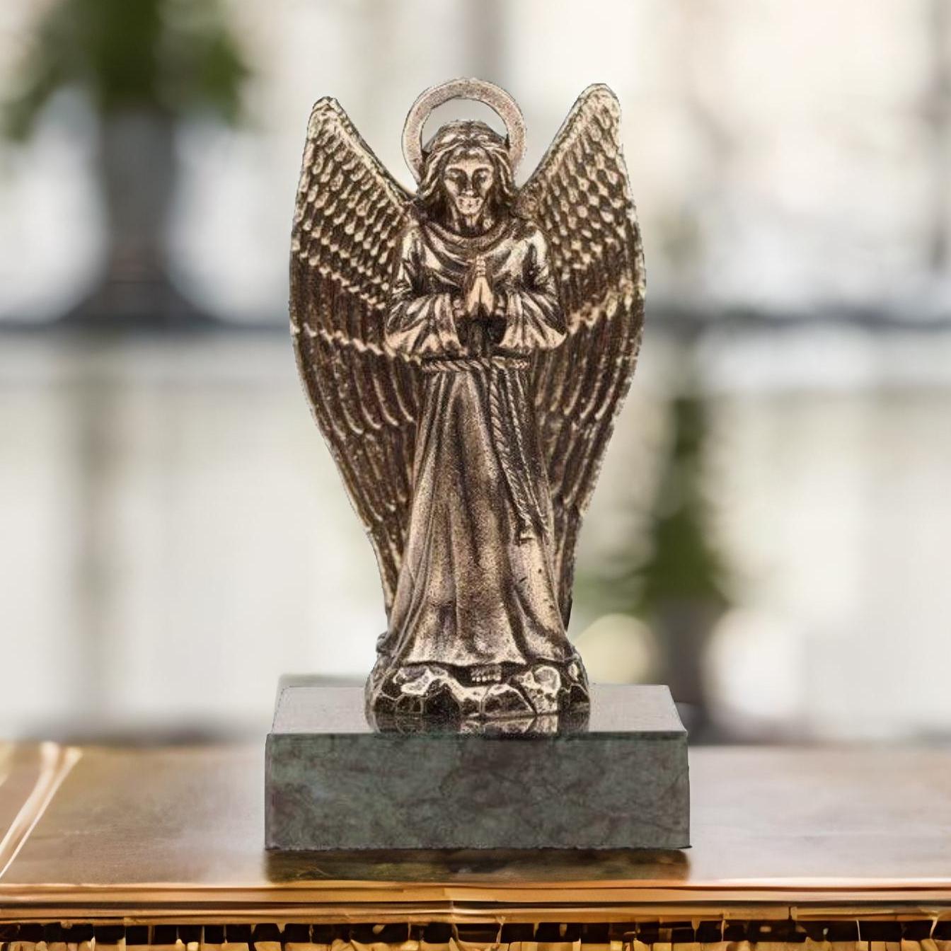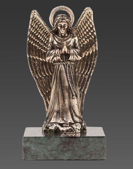 Ñòàòóýòêà â âèäå àíãåëà-õðàíèòåëÿ â äëèííîì îäåÿíèè ñ îãðîìíûìè êðûëüÿìè çà ñïèíîé è íèìáîì íàä ãîëîâîé, ñìèðåííî òâîðÿùåãî ñâîþ ìîëèòâó. Óíèêàëüíàÿ àâòîðñêàÿ êîìïîçèöèÿ, âûïîëíåííàÿ èç ïàòèíèðîâàííîé áðîíçû íà ïîäñòàâêå èç íàòóðàëüíîãî ïðèðîäíîãî êàìíÿ çìååâèêà, ñòàíåò íåîáû÷íûì öåííûì òåìàòè÷åñêèì ïîäàðêîì èëè óêðàñèò ñîáîé êîëëåêöèþ äîìàøíèõ ñâÿòûíü. |
