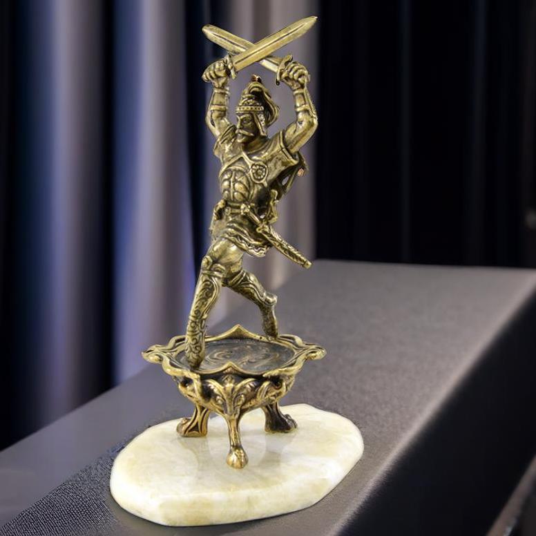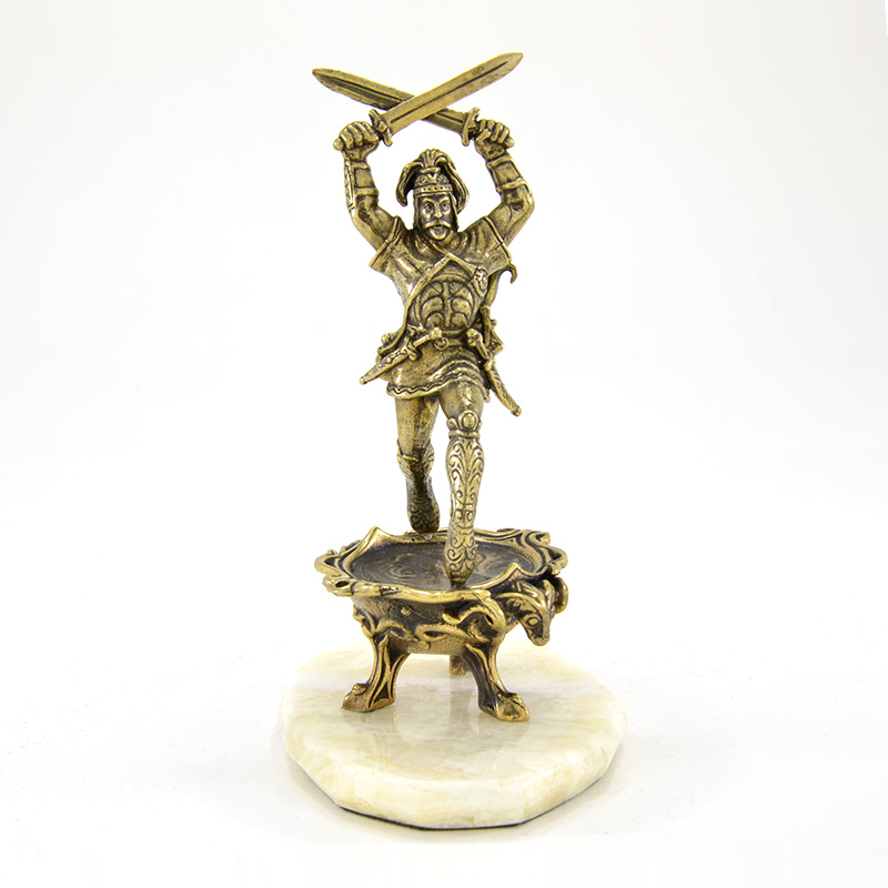 Áðîíçîâàÿ ñòàòóýòêà Ñîñëàíà - ãåðîÿ íàðòñêîãî ýïîñà, âîïëîòèâøåãîñÿ èç êàìíÿ. Ïîäàðîê äëÿ íàñòîÿùèõ âîèíîâ, à çíà÷èò ðóêîâîäèòåëåé. Ñîãëàñíî äàííûì èñòîðèêî-ýòèìîëîãè÷åñêîãî ñëîâàðÿ îñåòèíñêîãî ÿçûêà Ñîñëàí è Ñîñðóêî - èìåíà îäíîãî è òîãî æå ãåðîÿ. Ñîñëàí èçîáðàæåí â ãðàöèîçíîé áîåâîé ñòîéêå íà íîñêàõ ñ äâóìÿ ïåðåêðåùåííûìè íàä ãîëîâîé ìå÷àìè. Íà ãîëîâå ãåðîé íîñèò øëåì, à çà ñïèíîé êîë÷àí, íàïîëíåííûé ñòðåëàìè. Àìóíèöèþ åãî äîïîëíÿþò äâà êèíæàëà íà ïîÿñå, íàðó÷è è äëèííûå ñàïîãè, ðàñïèñàííûå íàðòñêèì óçîðîì. |